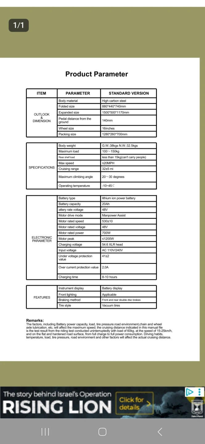 This is a KOALA electric folding bike, model GS5. It features a lithium-ion battery with a capacity of 48V 10Ah and a 700W motor. The bike has front and rear disc brakes and vacuum tires. Its folded size is 880x440x740mm.