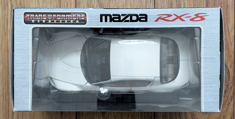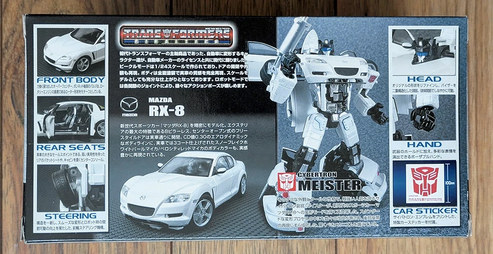 "Meister", BT-08, from the Transformers Binaltech line, brand new, factory sealed. Modelled after a white Mazda RX-8 in 1:24 scale.