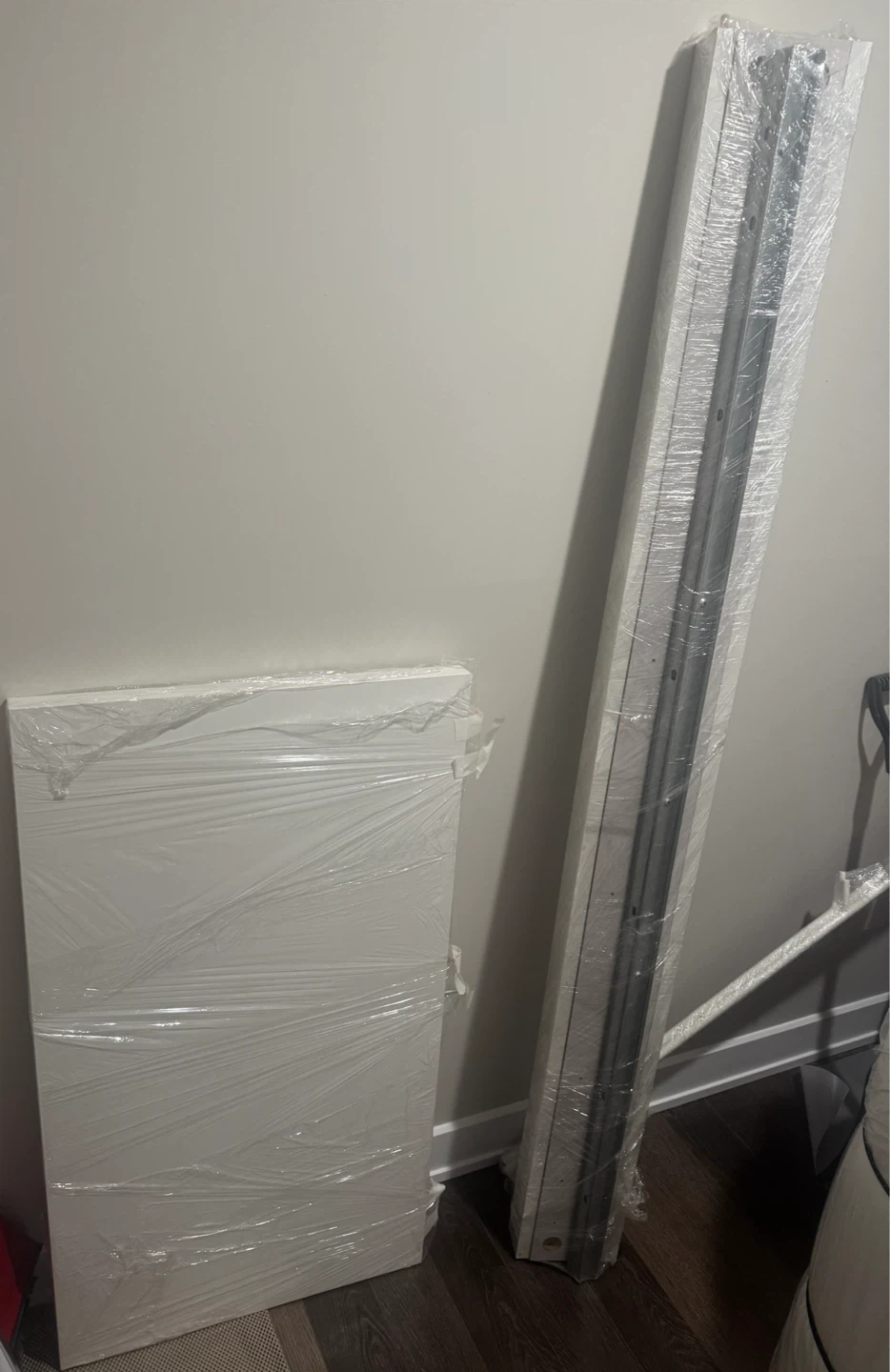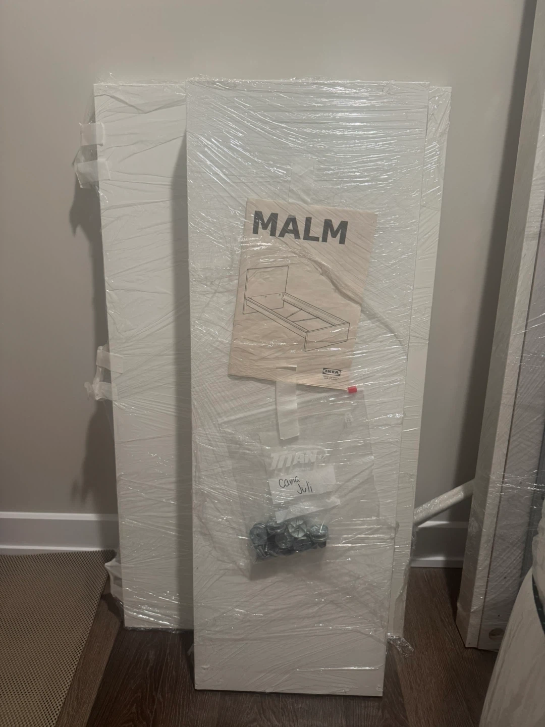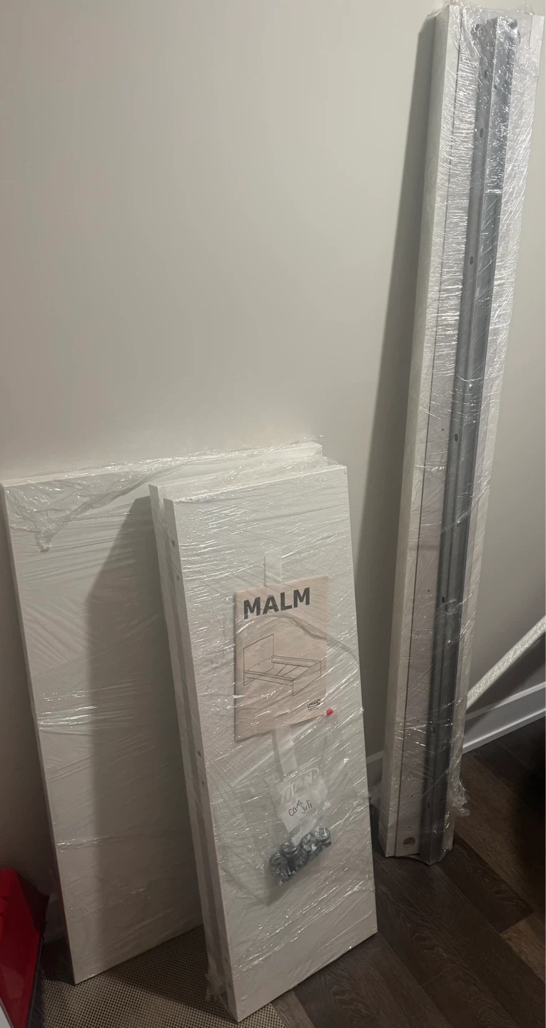This is a white twin-sized IKEA MALM bed frame. With assembly instructions and hardware included. It's a classic and versatile design.