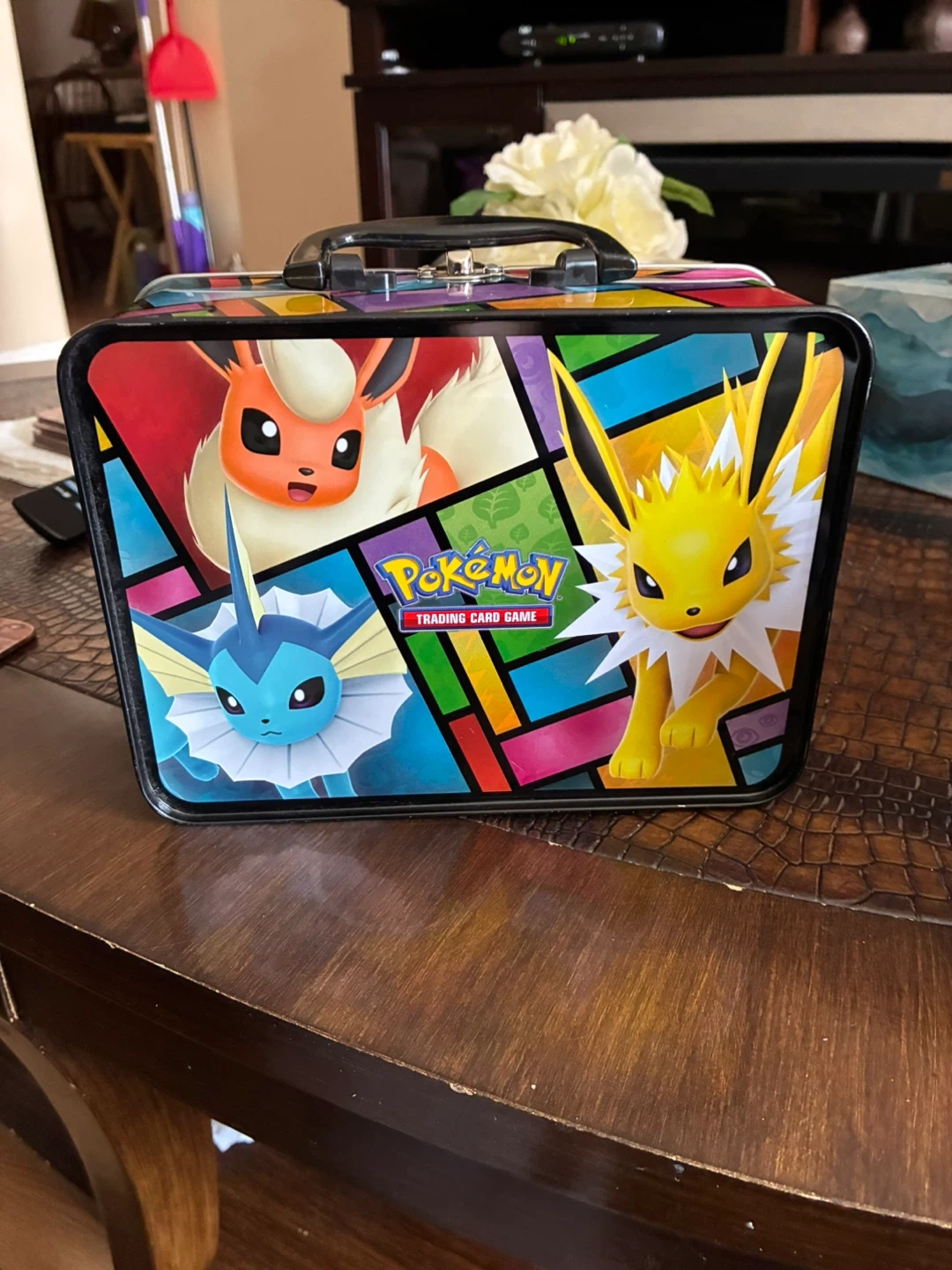 Selling a cool Pokémon Trading Card Game tin lunch box. It features popular Pokémon like Eevee, Vaporeon, Jolteon, Flareon, and Wooper. The tin has a sturdy handle and latch closure. Perfect for any Pokémon fan!