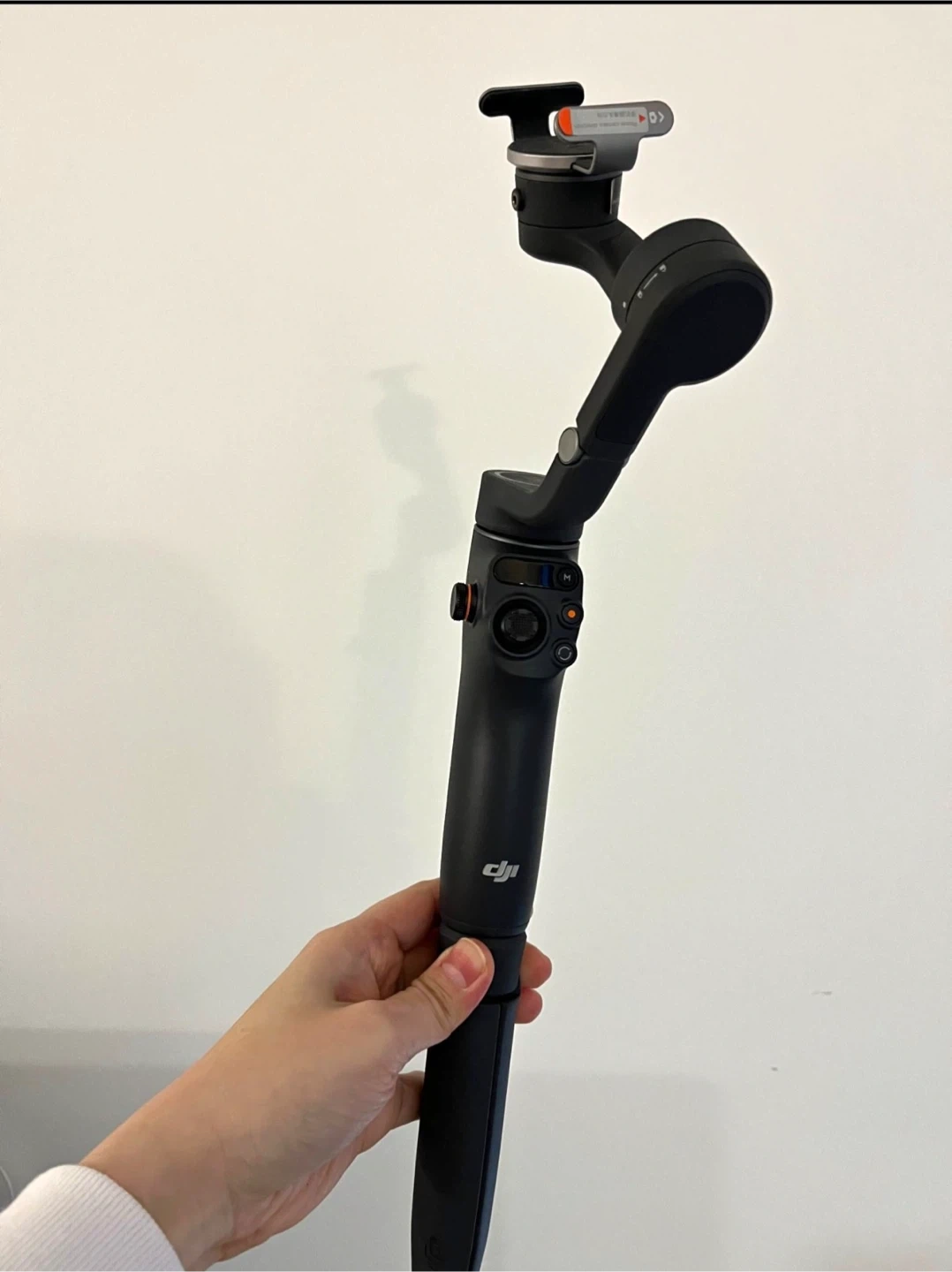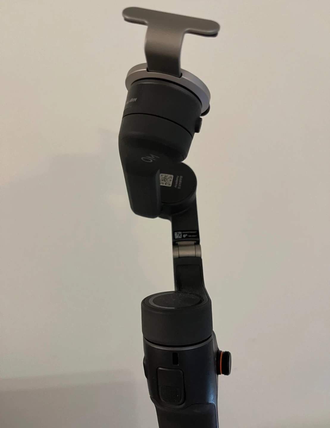 This DJI OM 5 is a portable smartphone gimbal. It's designed to stabilize your phone for smoother video footage. This gimbal includes a phone clamp and magnetic mount.