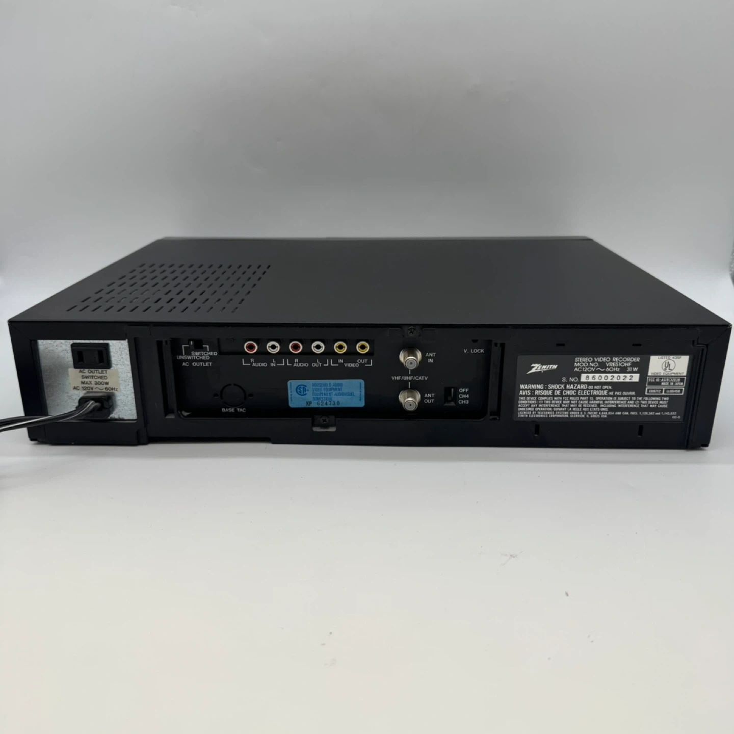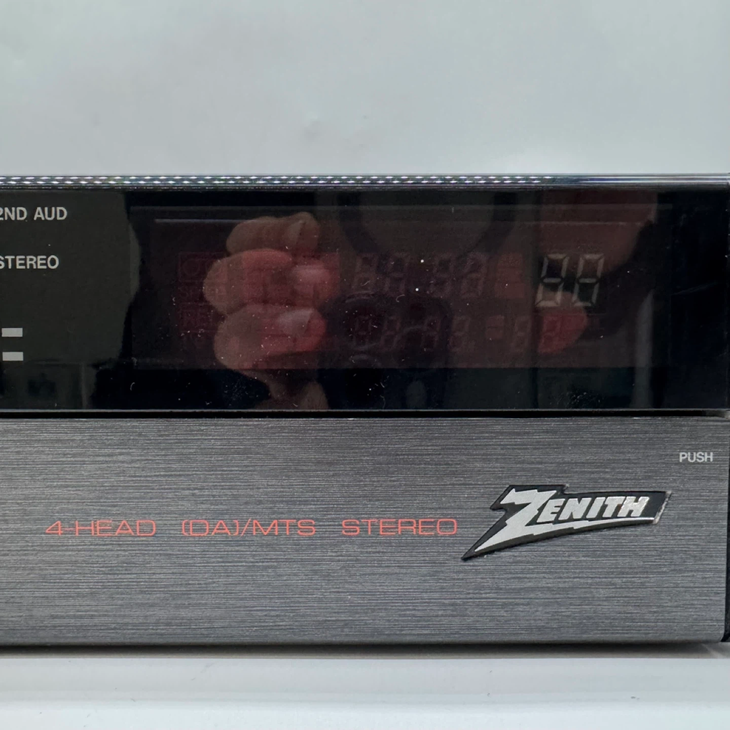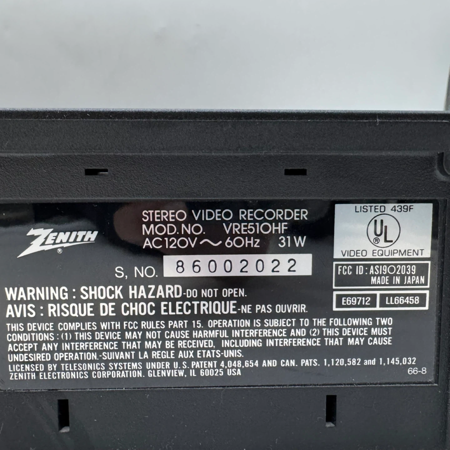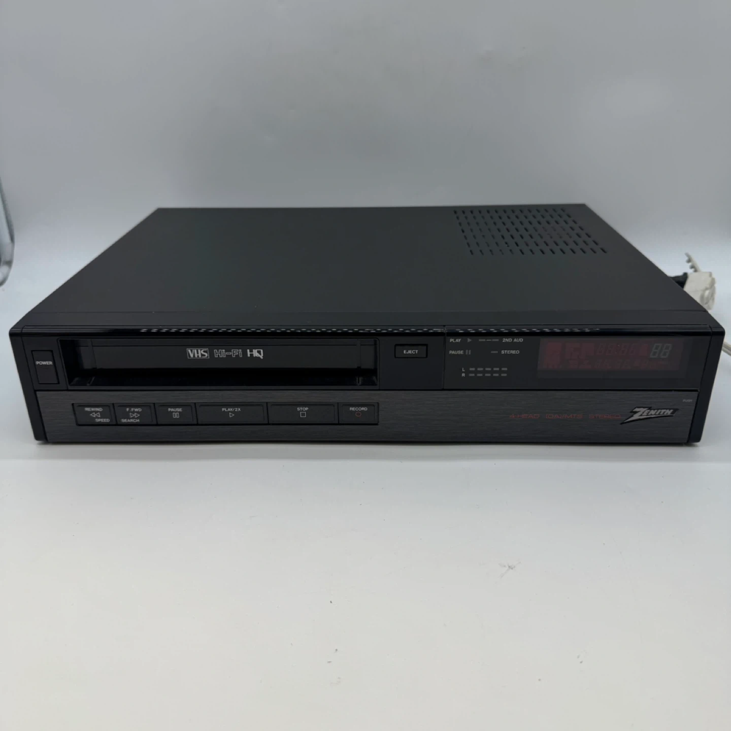 This unit is a Zenith VRE510HF 4-Head Hi-Fi HQ VCR, manufactured in Japan and known for reliable playback and stereo sound quality. The unit powers on and is in very good cosmetic condition with normal light signs of use.