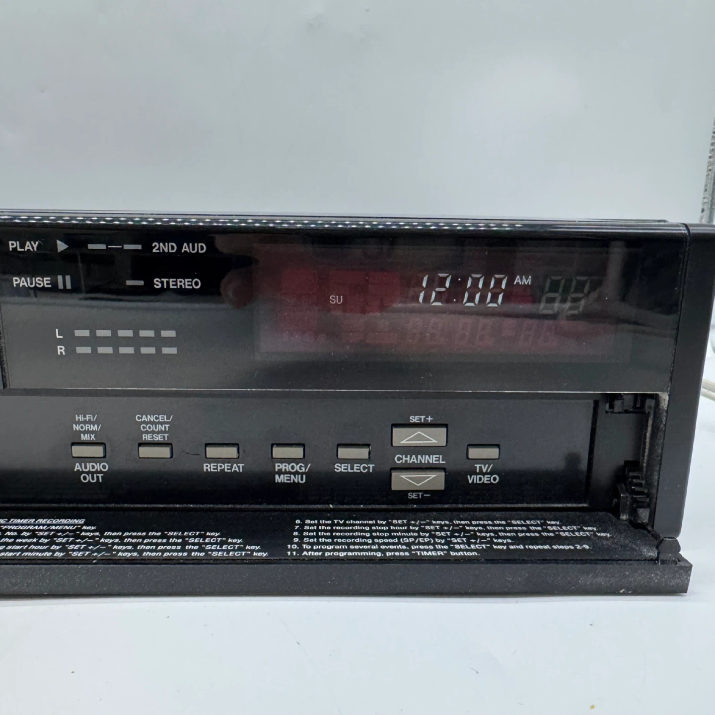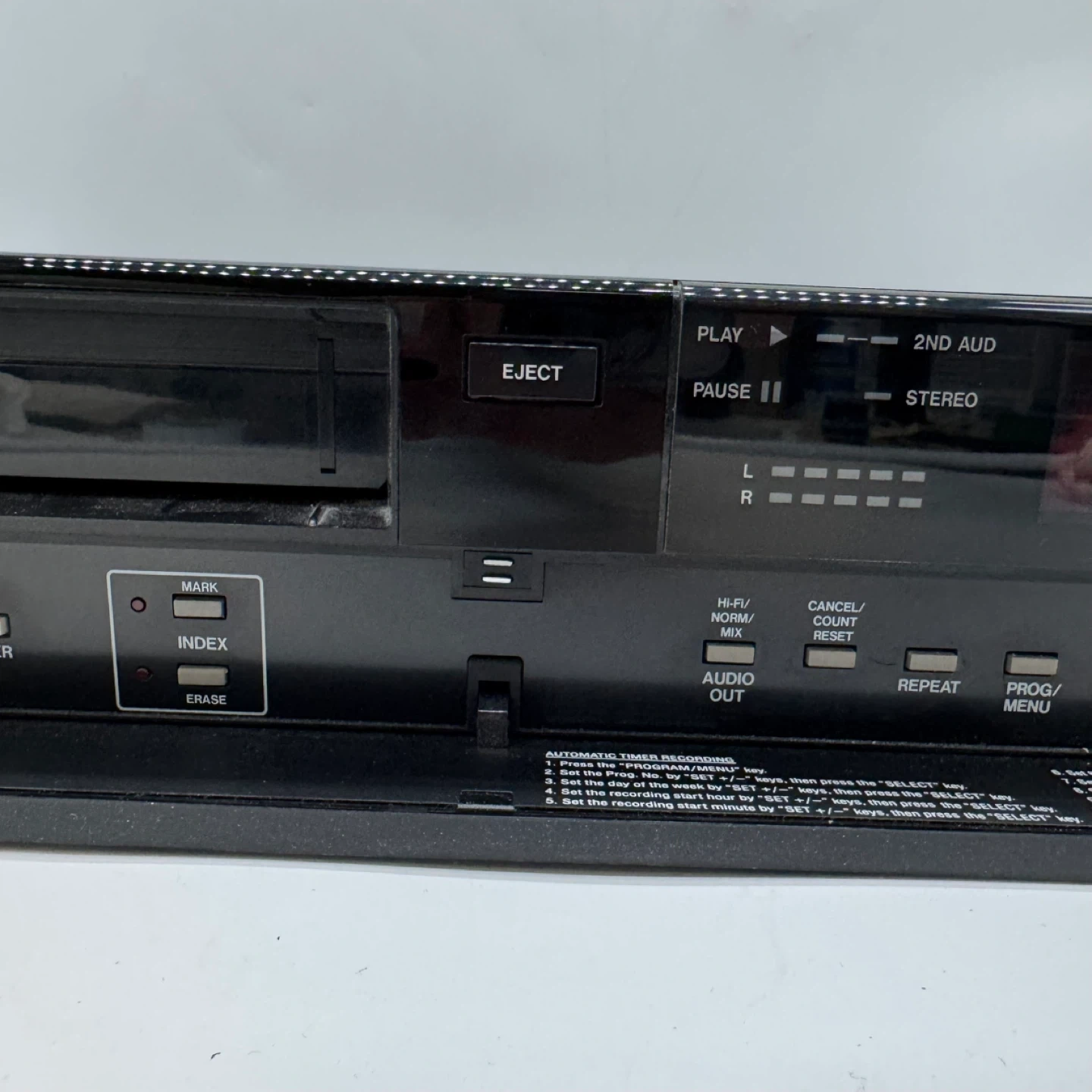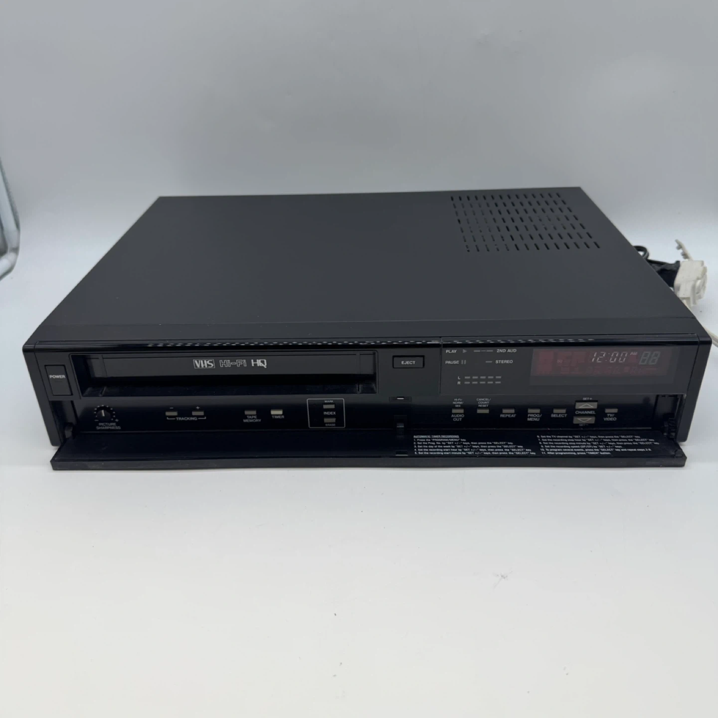 The front panel features tracking control, timer recording functions, and stereo audio output. Perfect for playing or digitizing vintage VHS tapes.