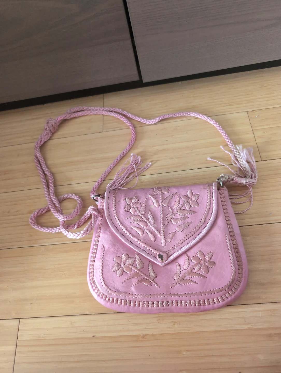 Pretty pink shoulder bag with floral embroidery. It has a braided strap and fringed details. This bag's size is small, perfect for carrying essentials. From Morocco