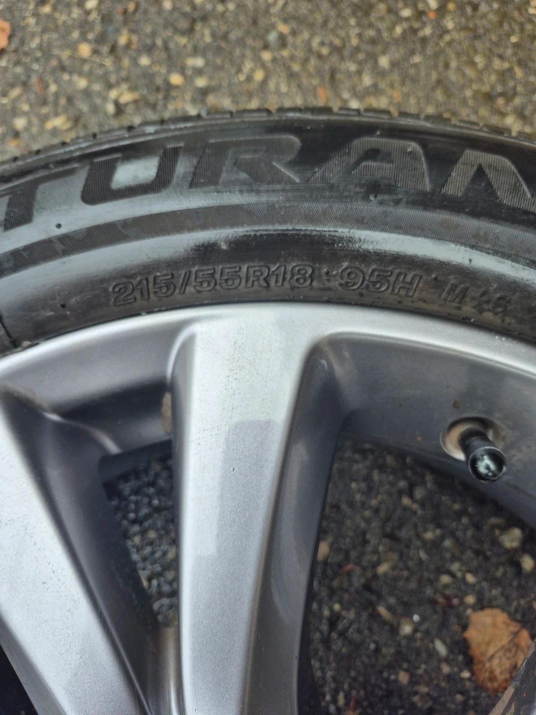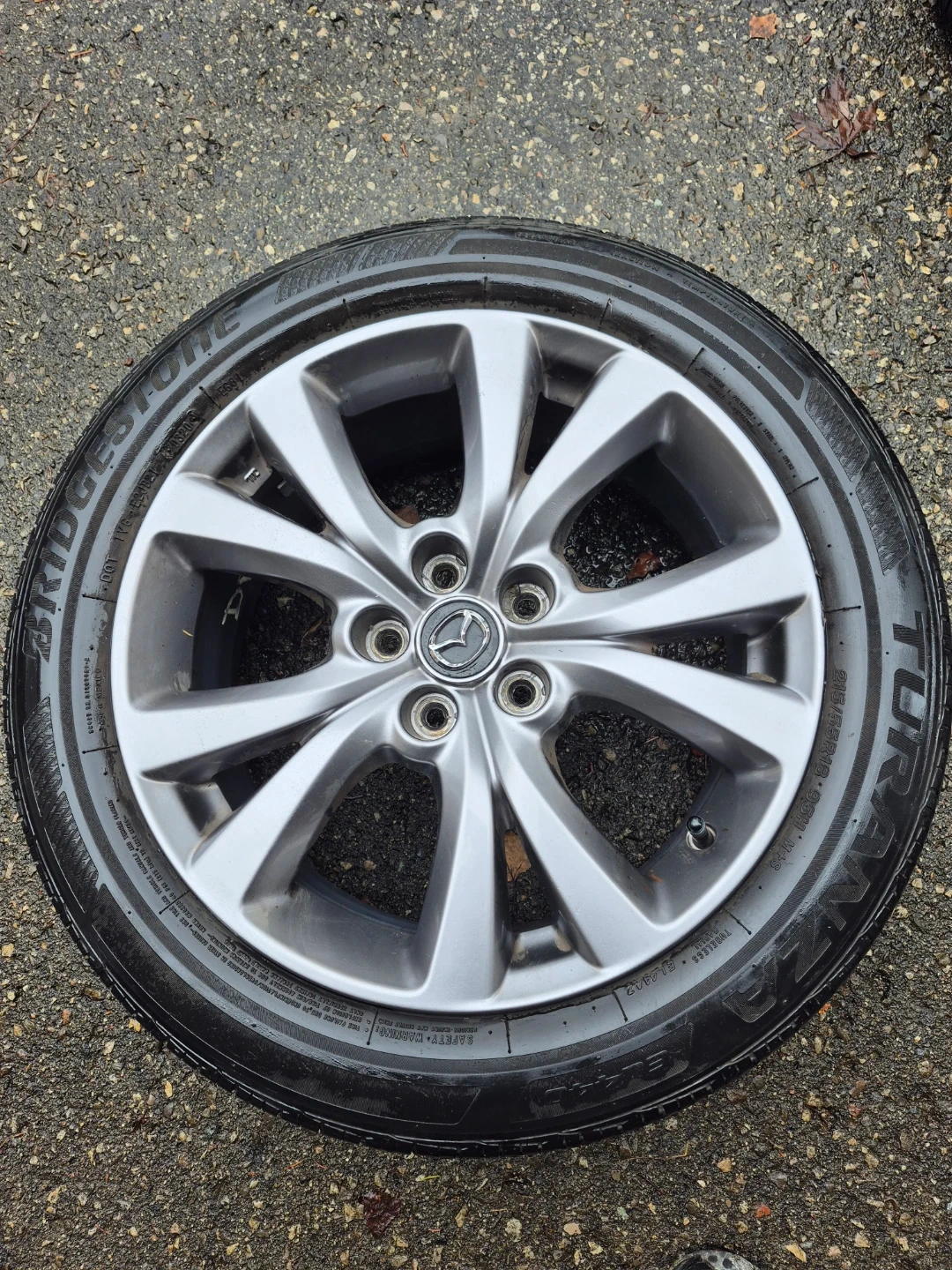 Mazda alloy wheels with Bridgestone Turanza tires. Tire size is 215/55R18 95H. Set of four tires