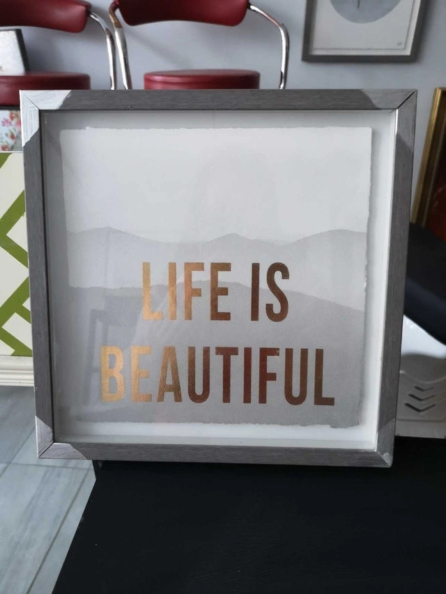 Add a touch of inspiration to your home with this framed wall art, featuring a grey frame and the words "Life is Beautiful" in rose gold lettering. This piece is in used, but good condition, ready to uplift any room with its simple yet elegant design. If the ad is up, it's still available.