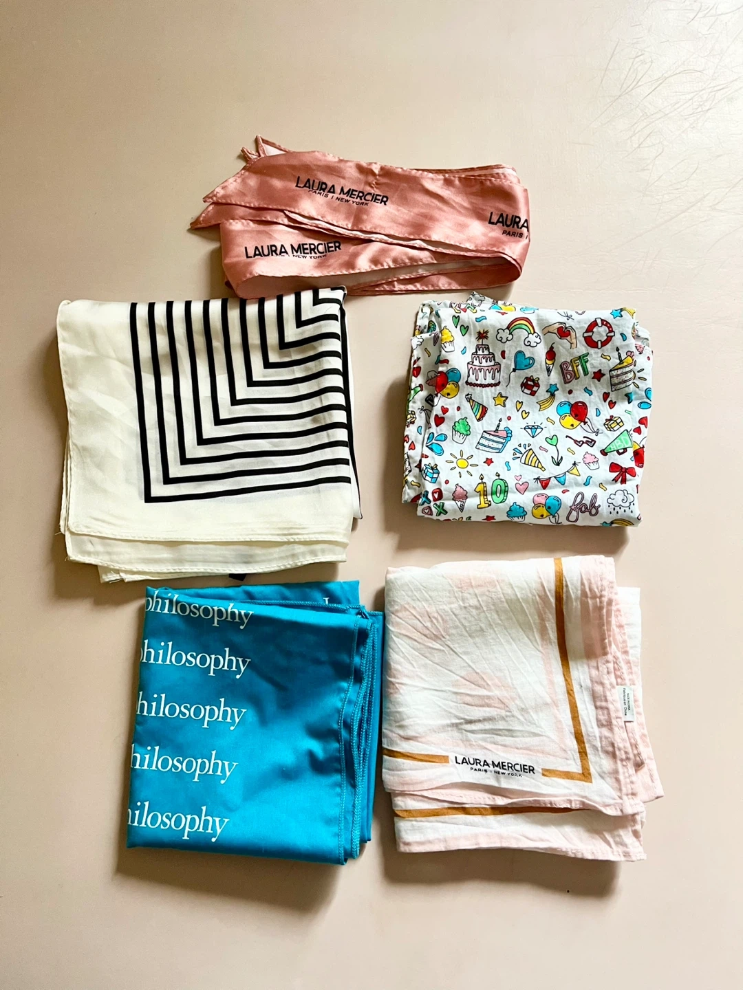 Bundle of 5 Scarves: Laura Mercier, Dell'Ama, Philosophy