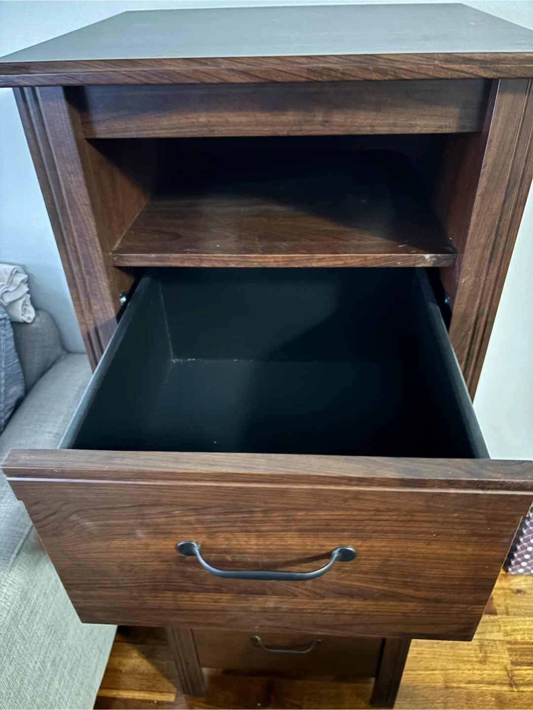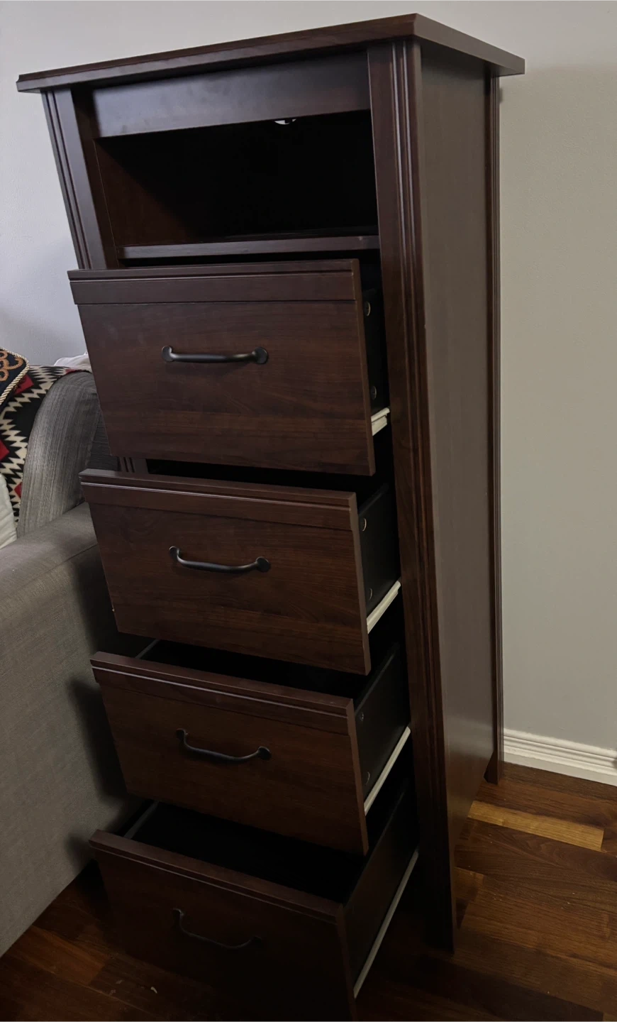 This tall, narrow chest features four drawers for storage and an open shelf at the top. It's made of dark wood with black handles. Great for organizing smaller spaces!