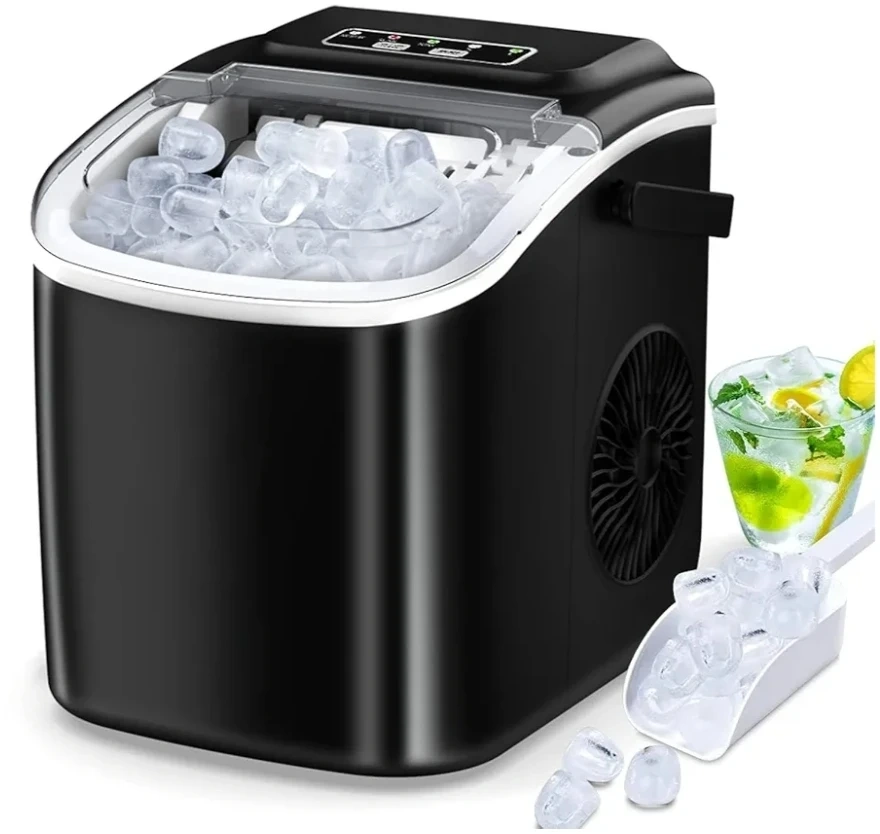 This portable ice maker produces ice quickly. It's compact and easy to use with a self-cleaning function. This machine is great for your home or office.