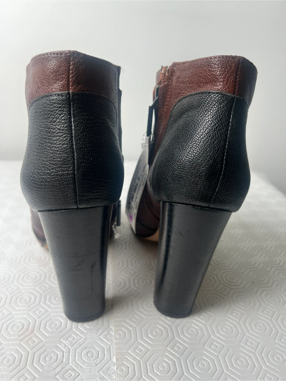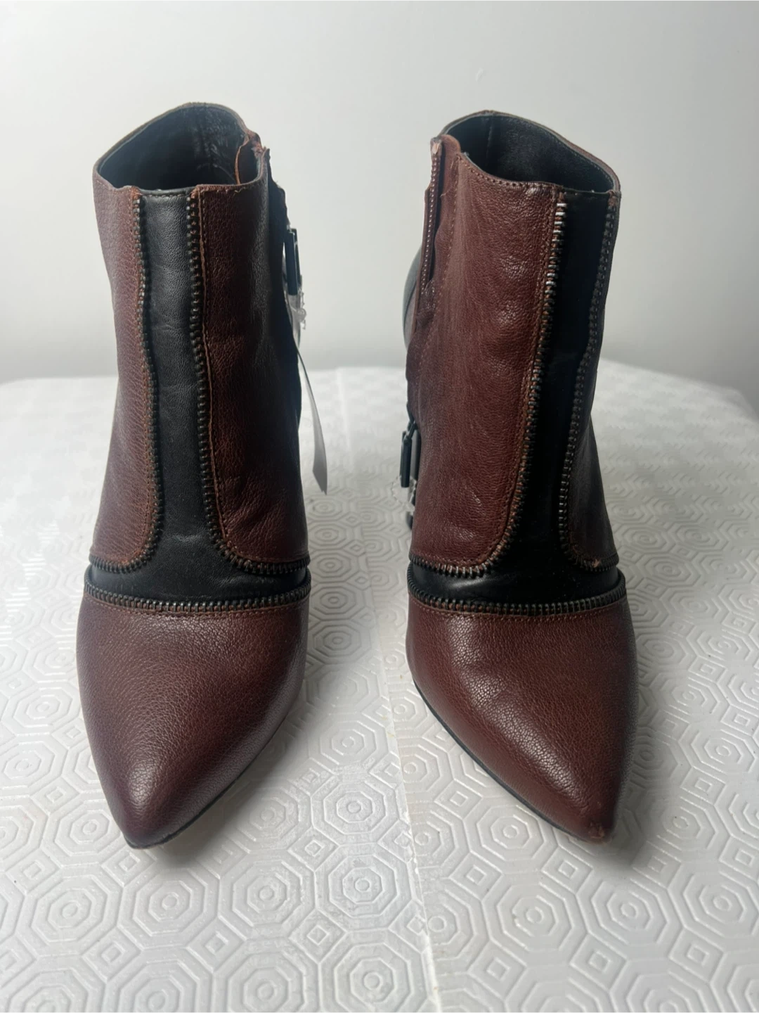 Stylish brown and black leather ankle boots with a pointed toe and side zippers. Features a chunky heel for added height. These boots are a size 7.