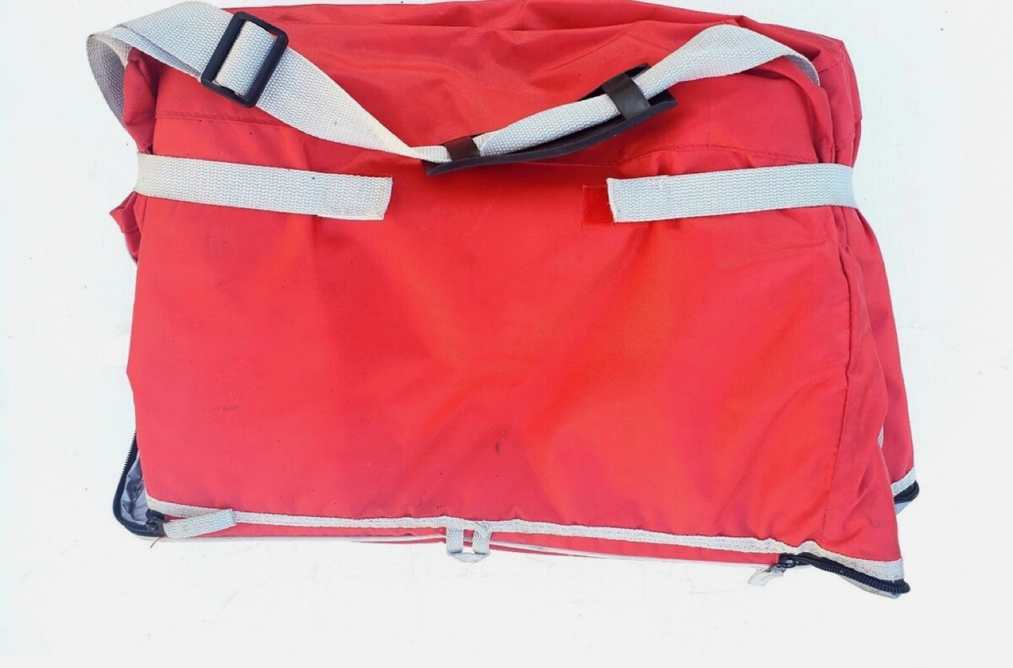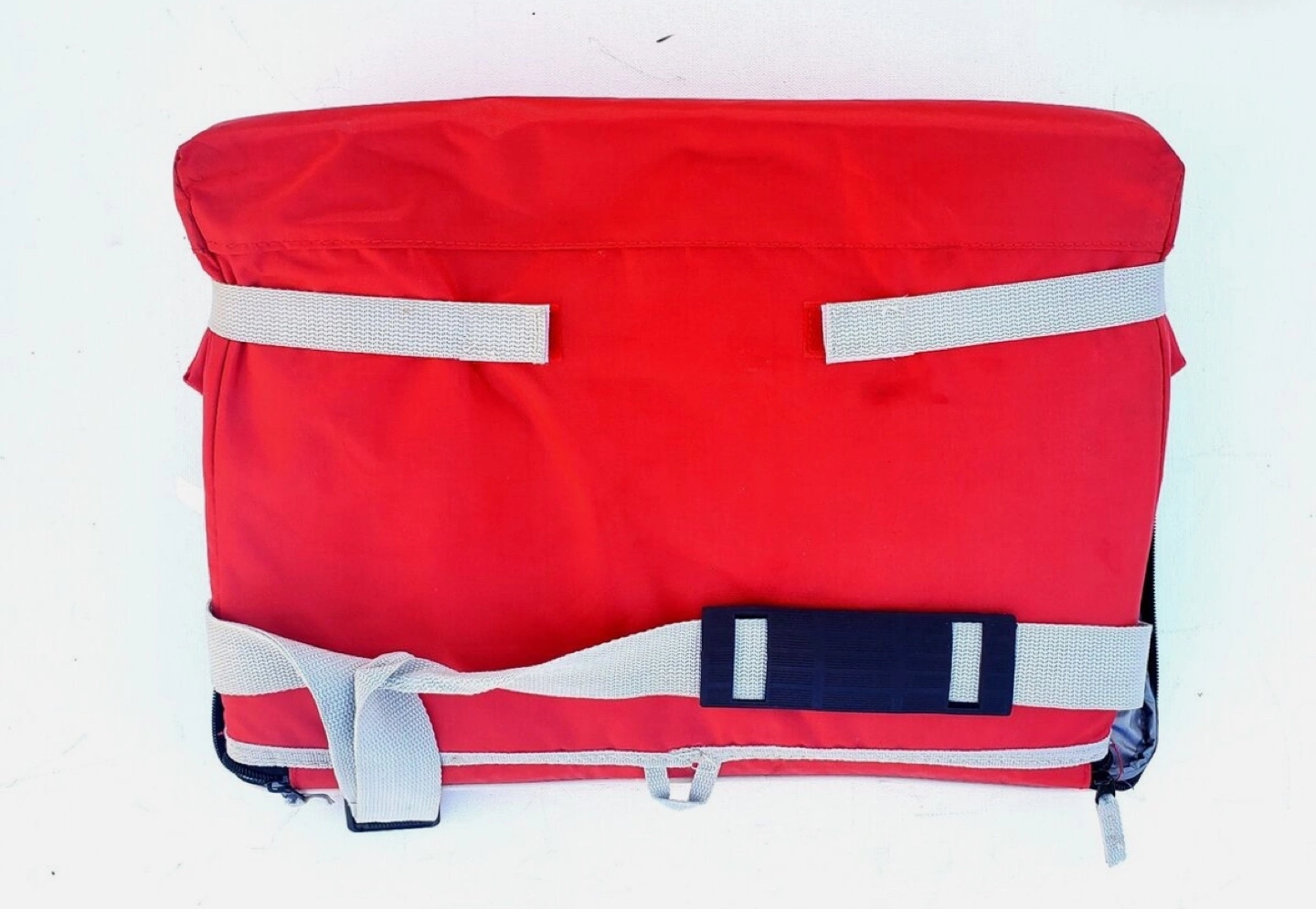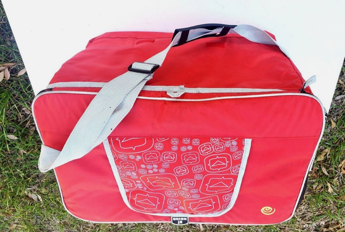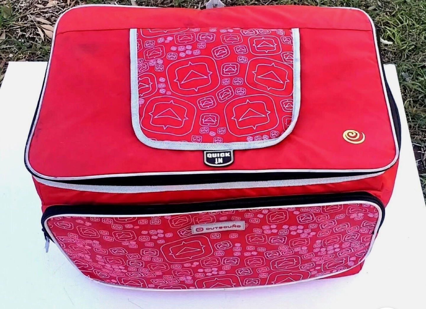 Red insulated cooler bag. Features a large main compartment, zippered closure, and adjustable shoulder strap. Keeps food and drinks cold. Great for picnics, outings, or transporting food. Portable Insulated 48 Can Cooler Collapsible, Red