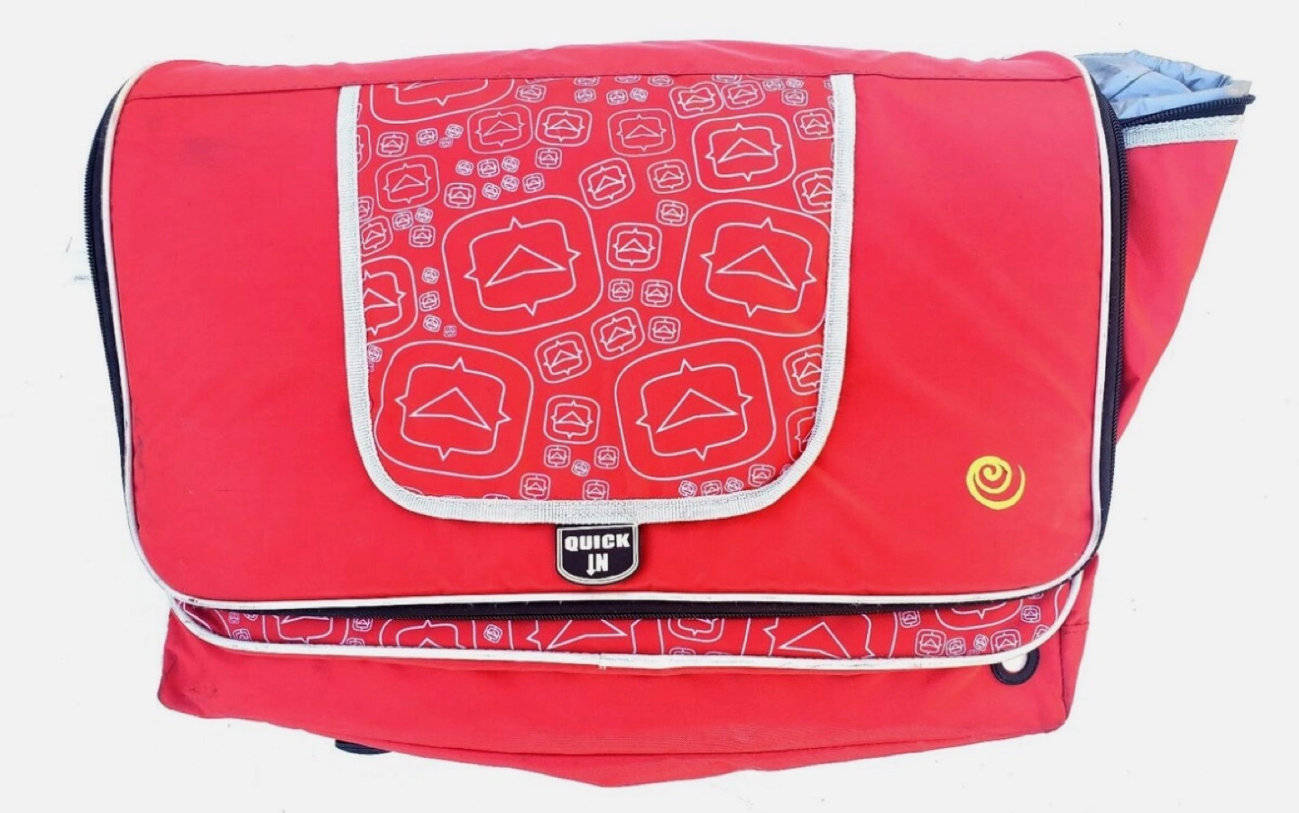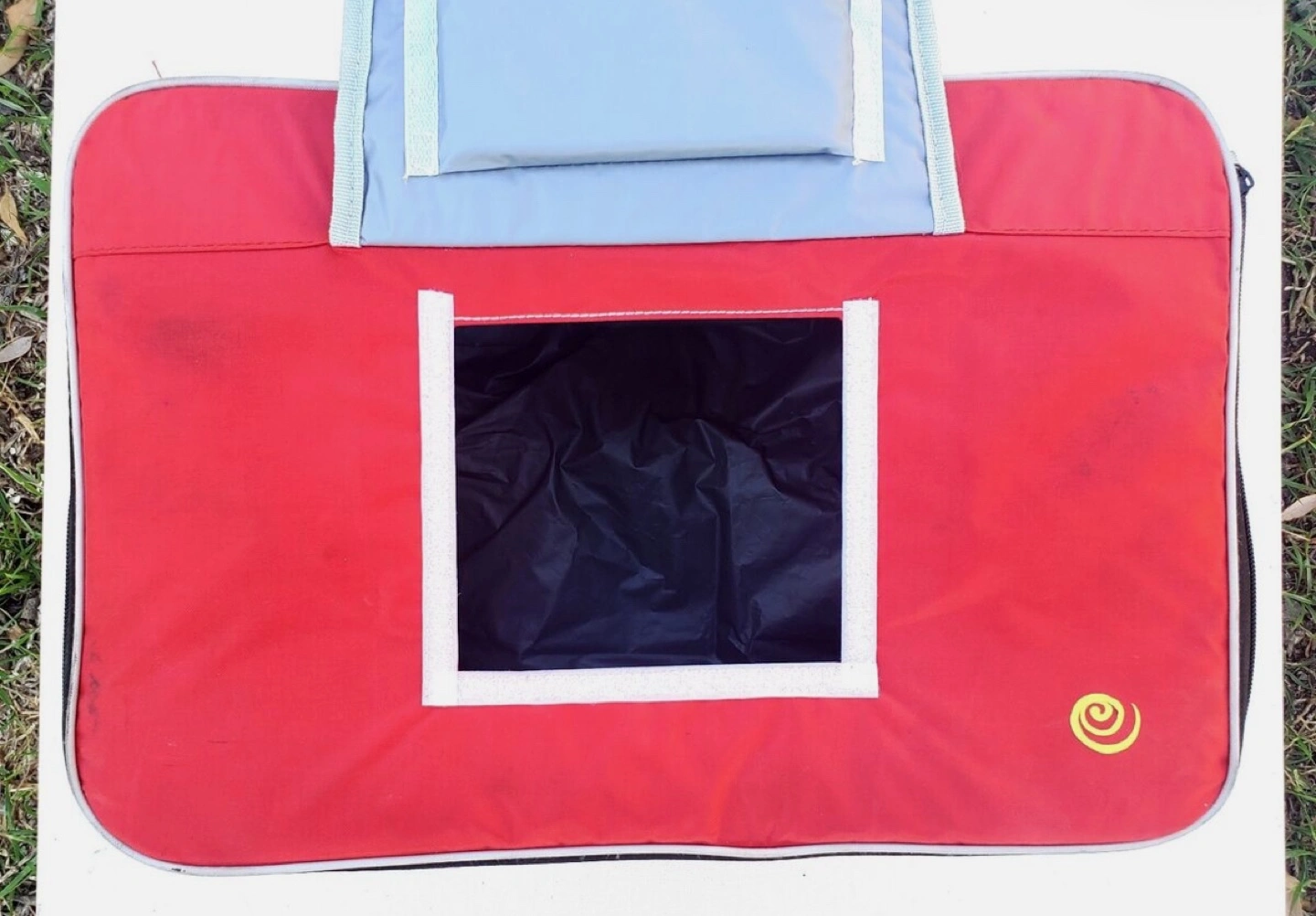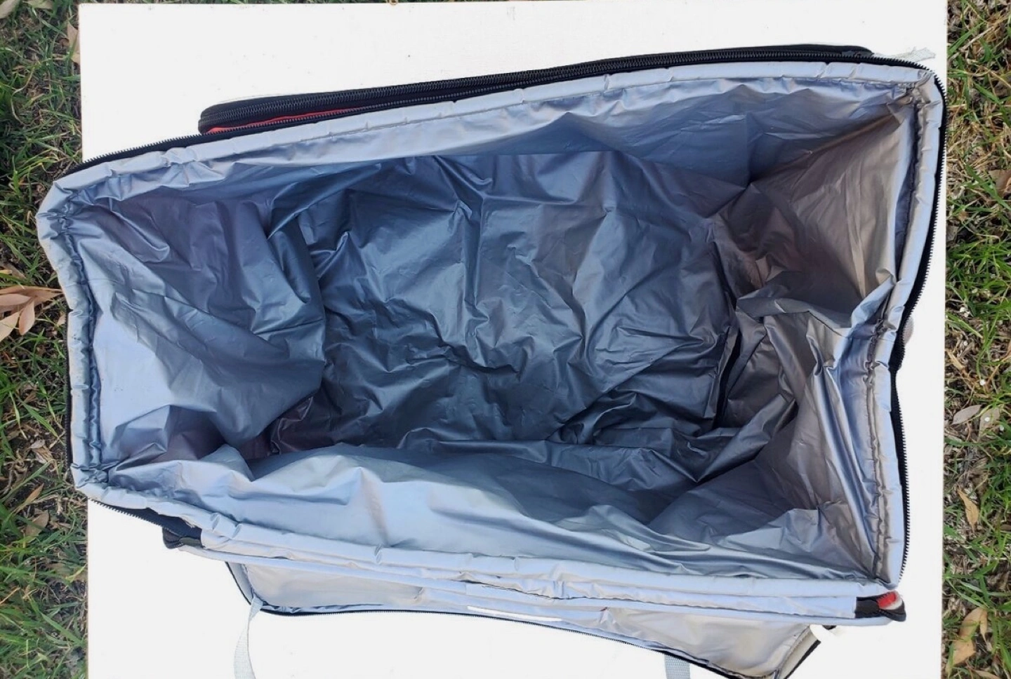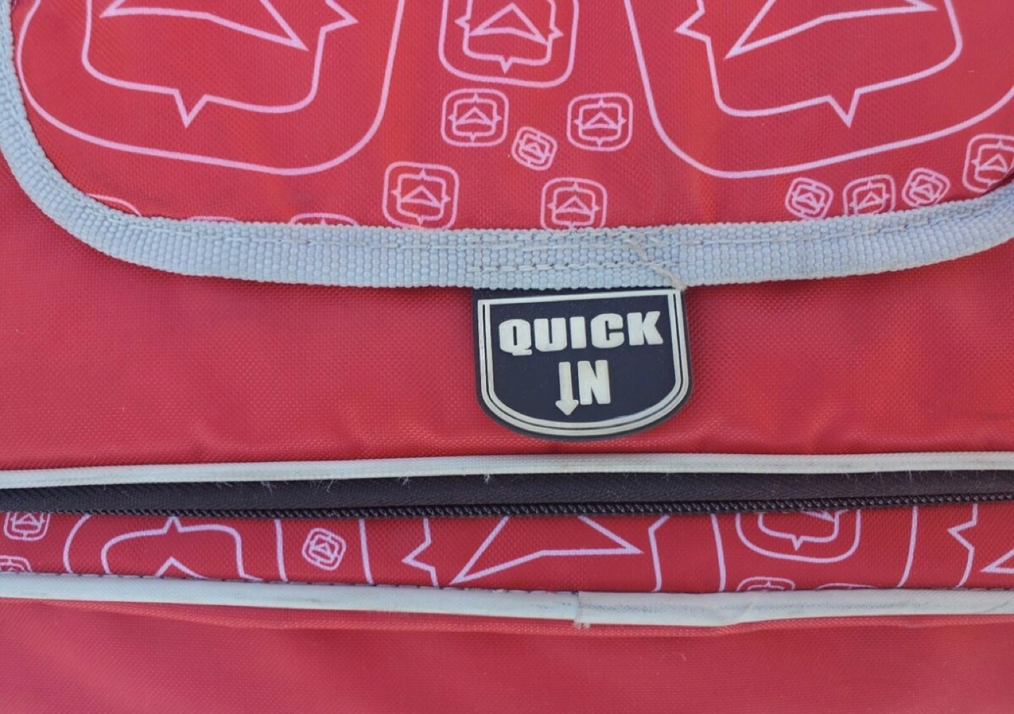 Red insulated cooler bag. Features a large main compartment, zippered closure, and adjustable shoulder strap. Keeps food and drinks cold. Great for picnics, outings, or transporting food. Portable Insulated 48 Can Cooler Collapsible, Red