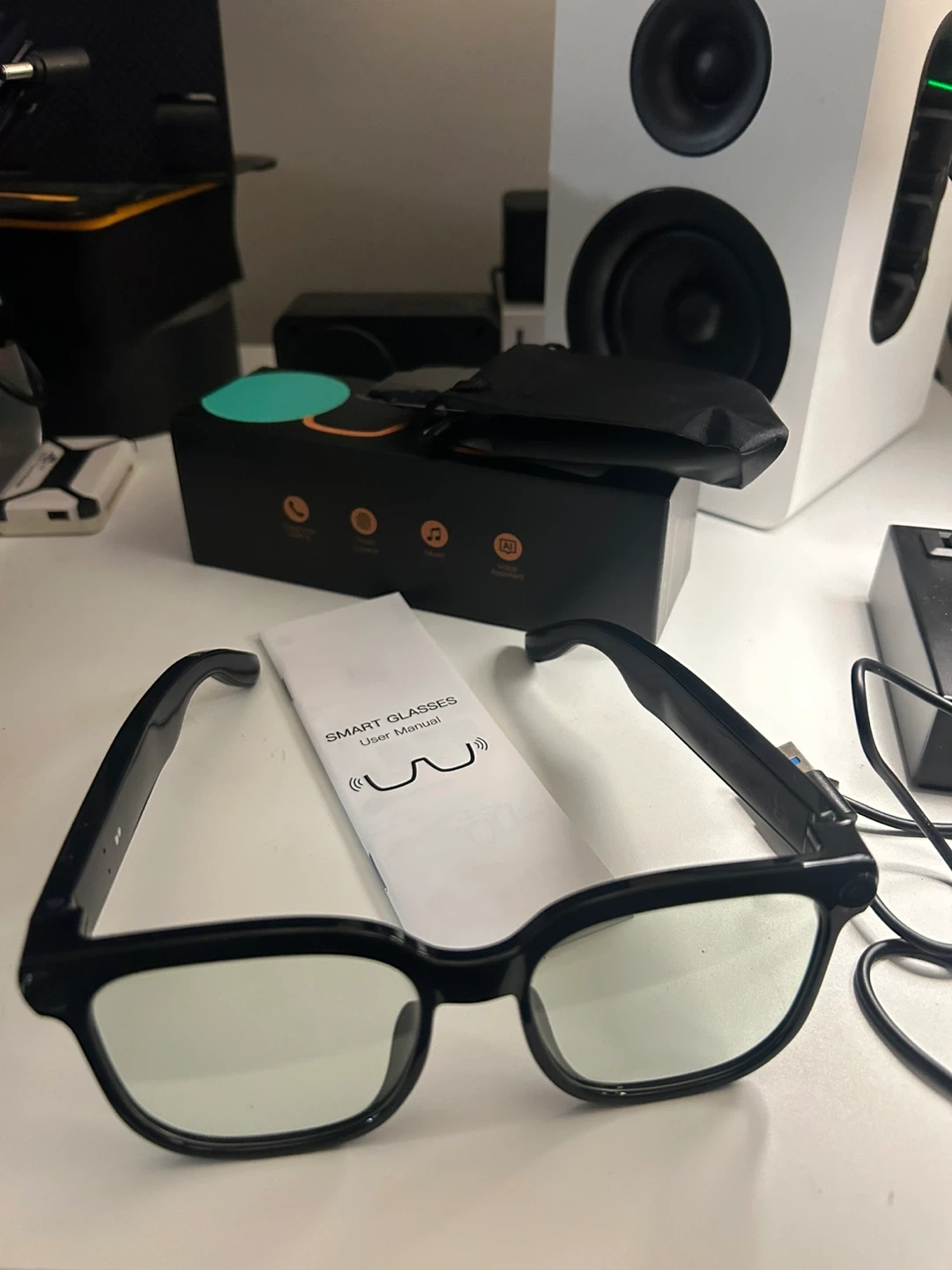 These black smart glasses are a neat piece of tech. They come with a user manual and a carrying pouch. These would be great for someone interested in trying out wearable smart devices!