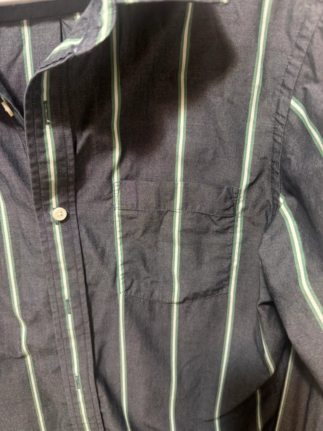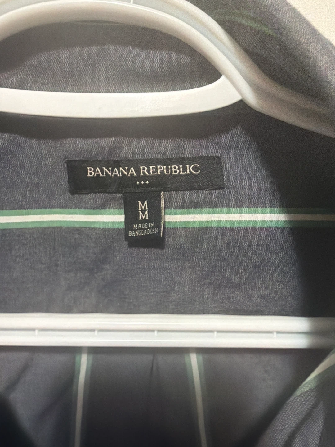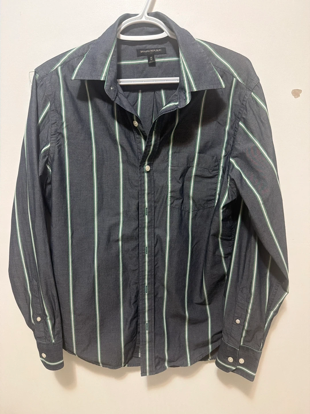 This is a Banana Republic long-sleeved button-up shirt. It's made of 100% cotton and features a classic stripe pattern in dark grey with green and white accents. The size is medium.