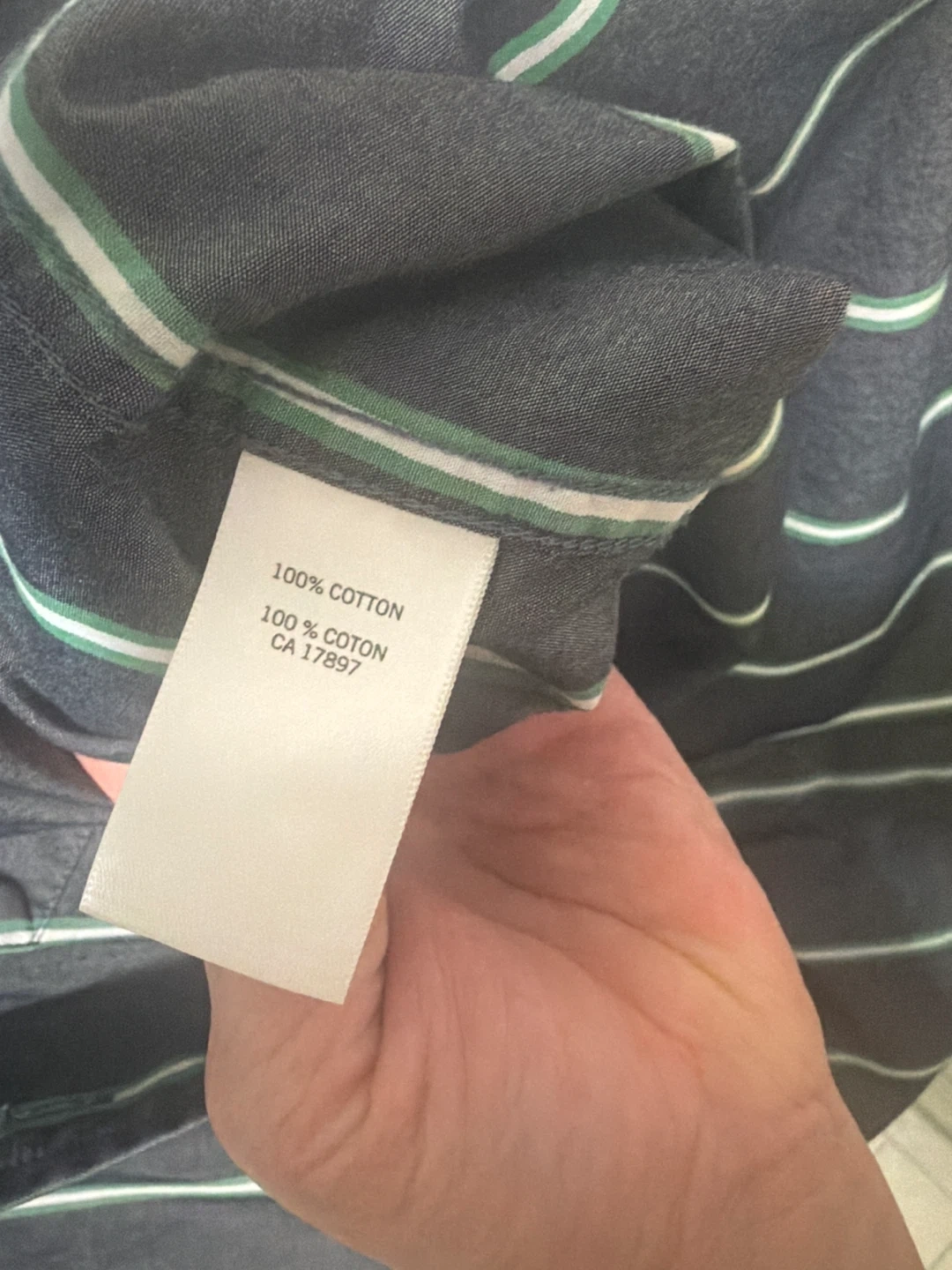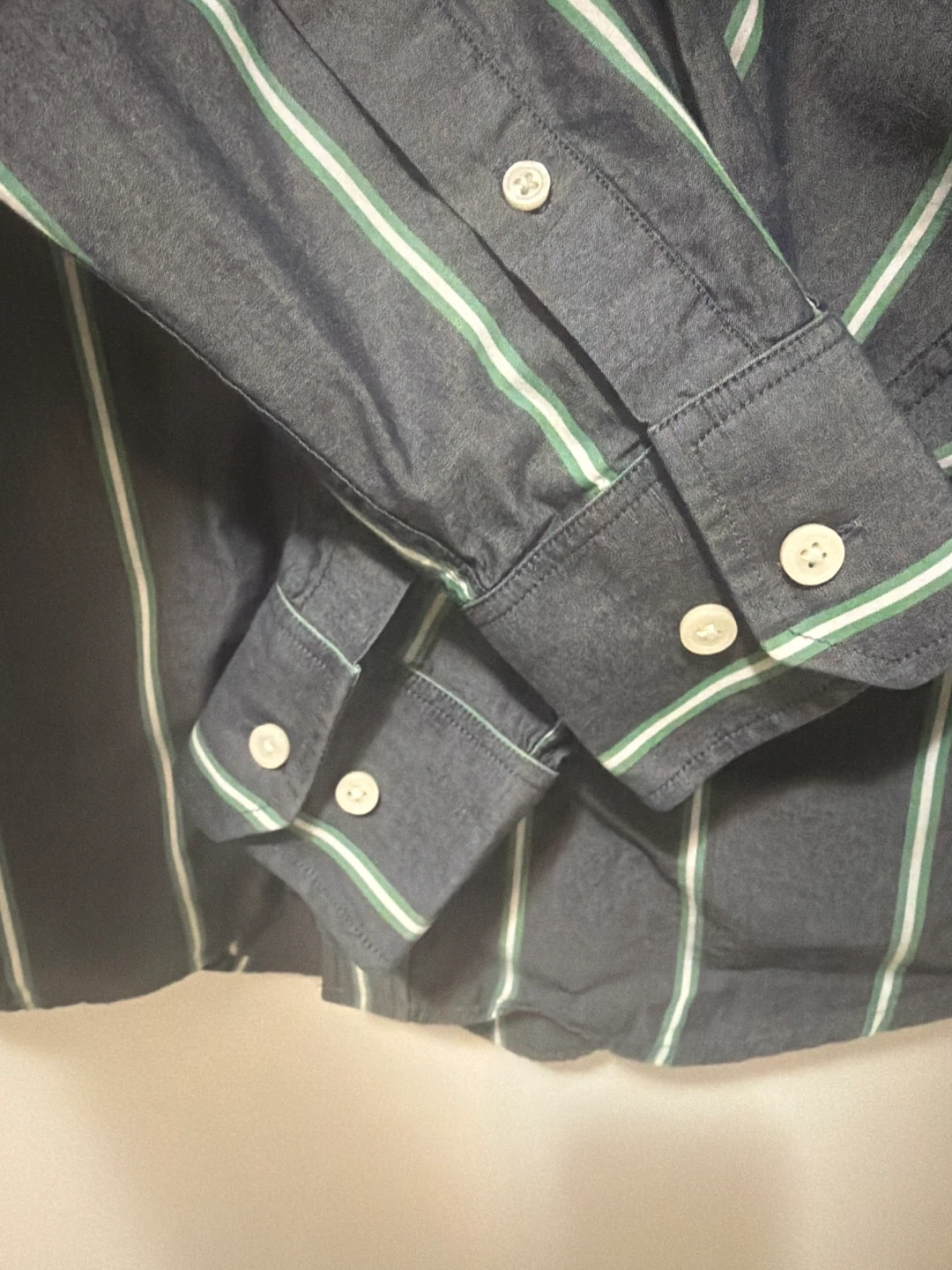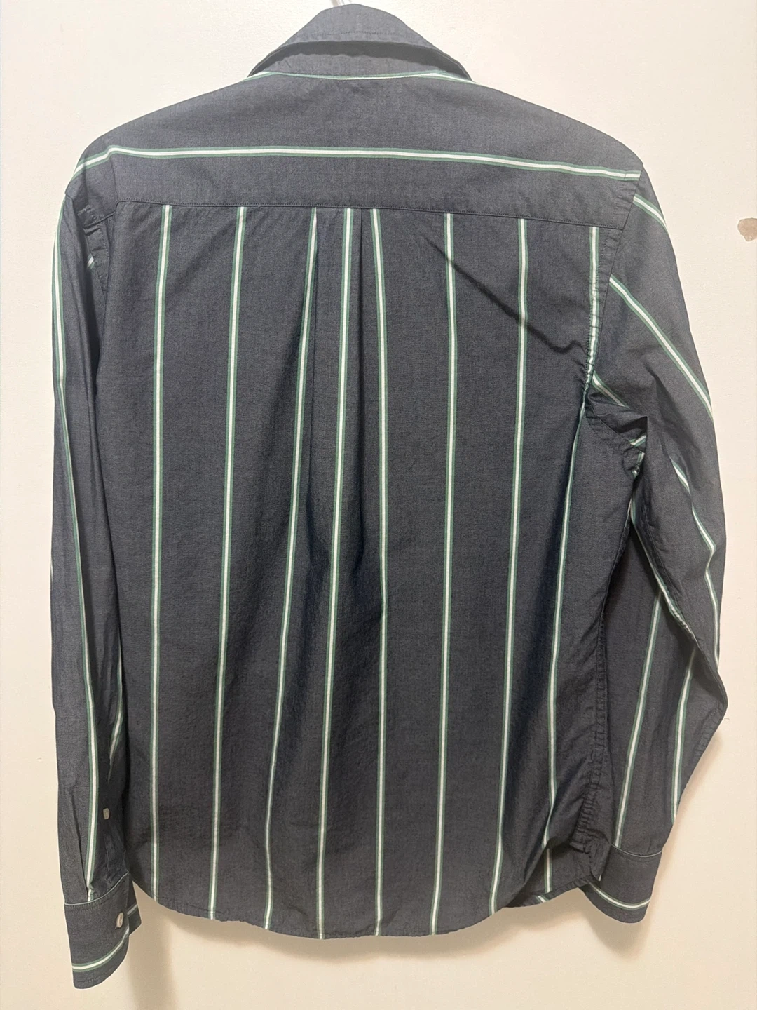 This is a Banana Republic long-sleeved button-up shirt. It's made of 100% cotton and features a classic stripe pattern in dark grey with green and white accents. The size is medium.