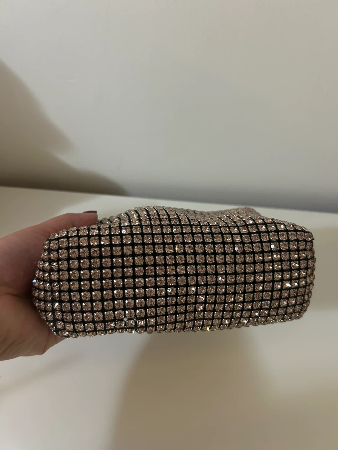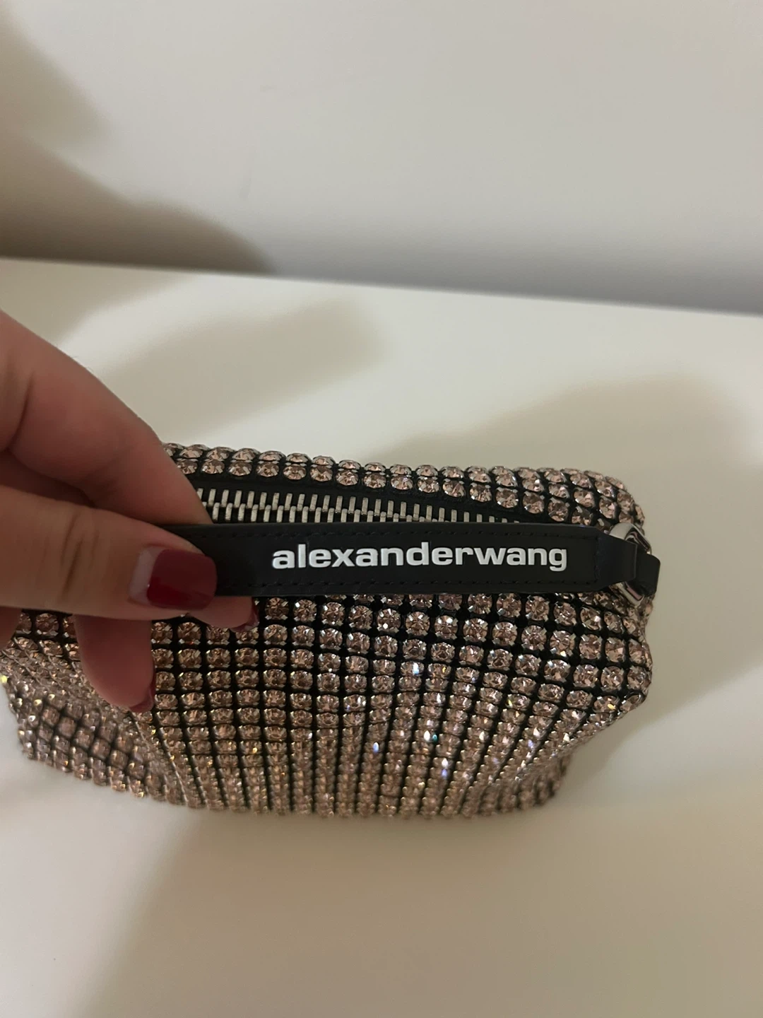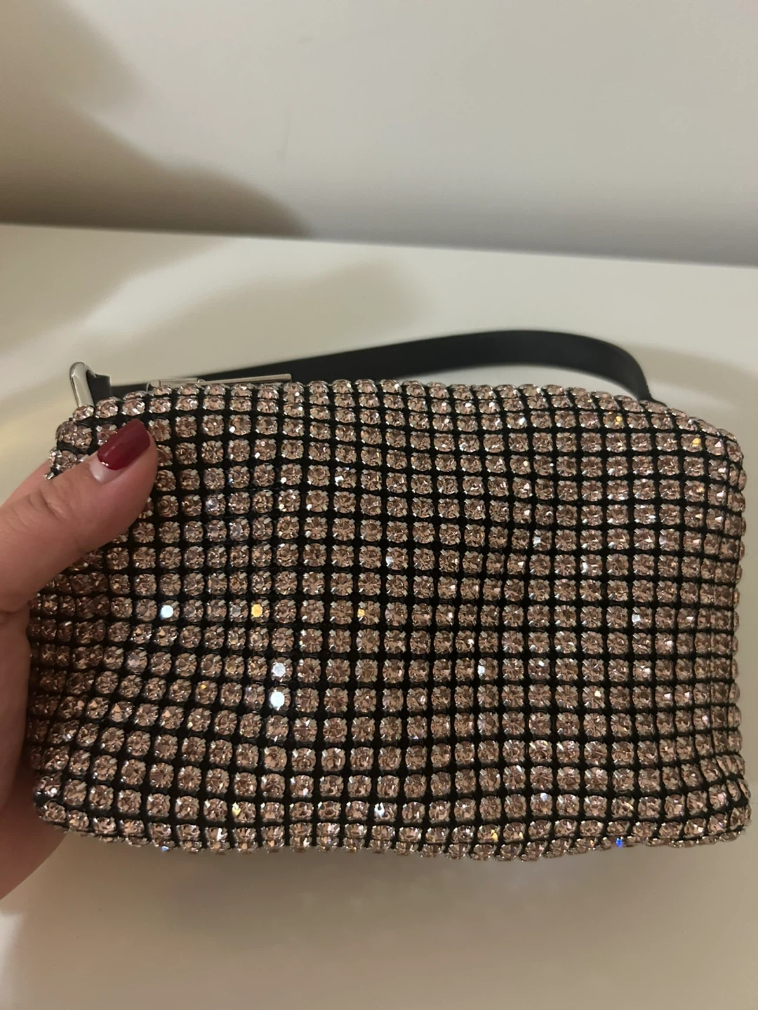 Alexander Wang mini bag covered in shimmering rhinestones. Features a top zipper closure and a single strap. This bag adds a touch of sparkle to any outfit! used once