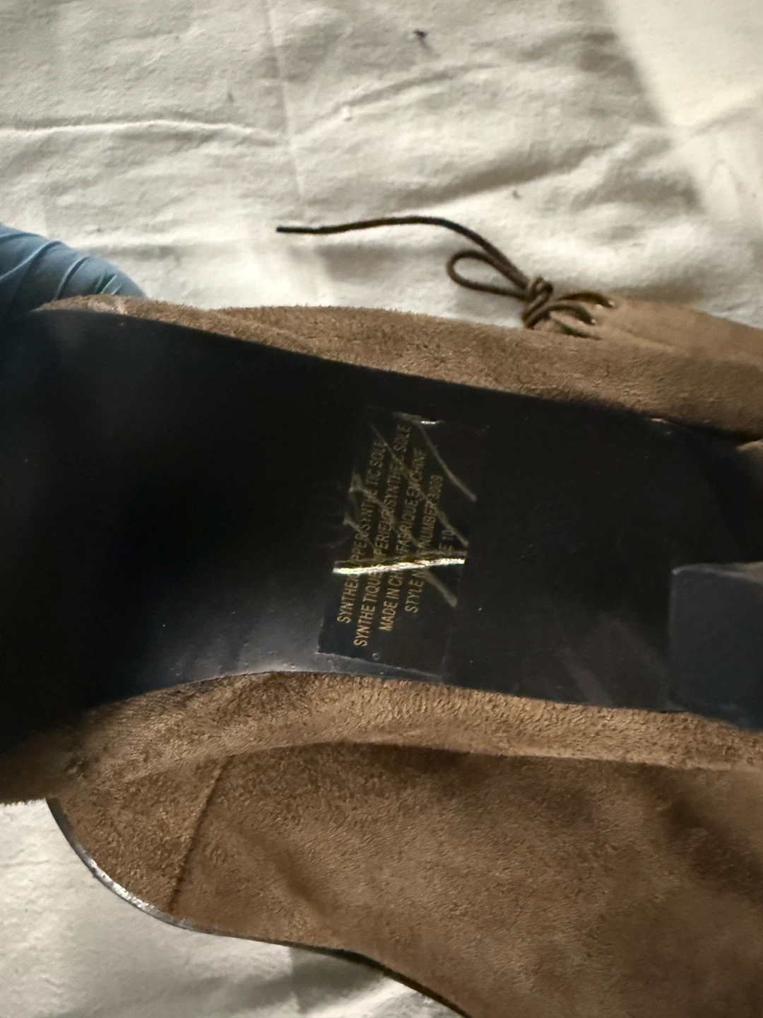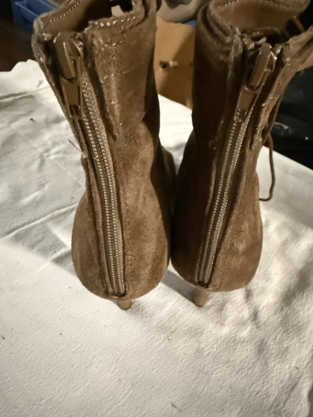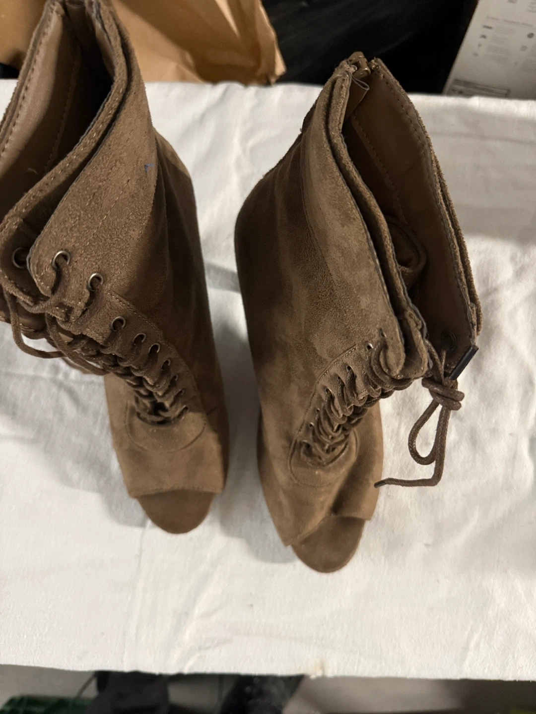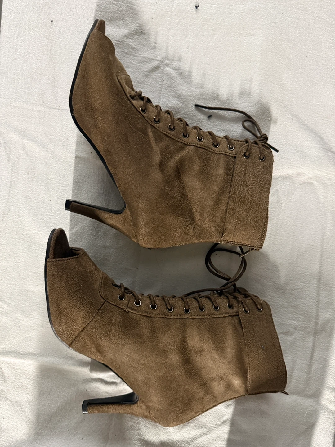 Stylish brown suede heeled boots with a peep-toe design. They feature a front lace-up closure and a back zipper for easy wear. The heel is a slender stiletto. These boots are made with synthetic materials. Perfect for dressing up an outfit!