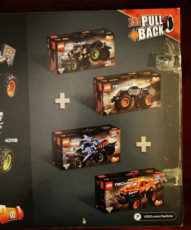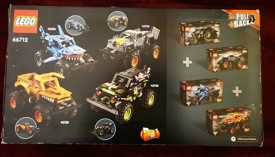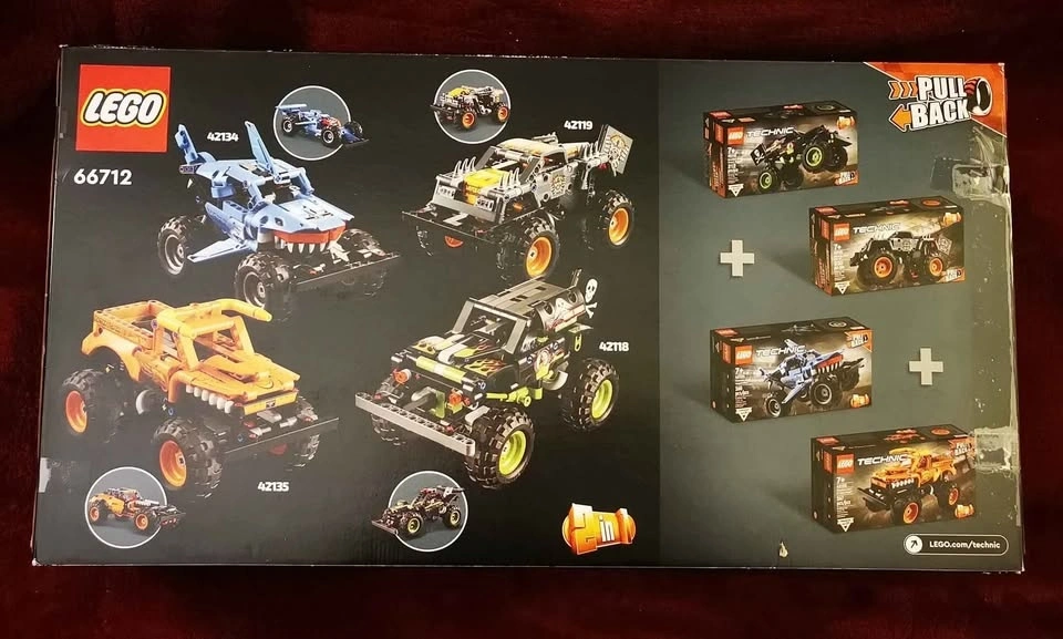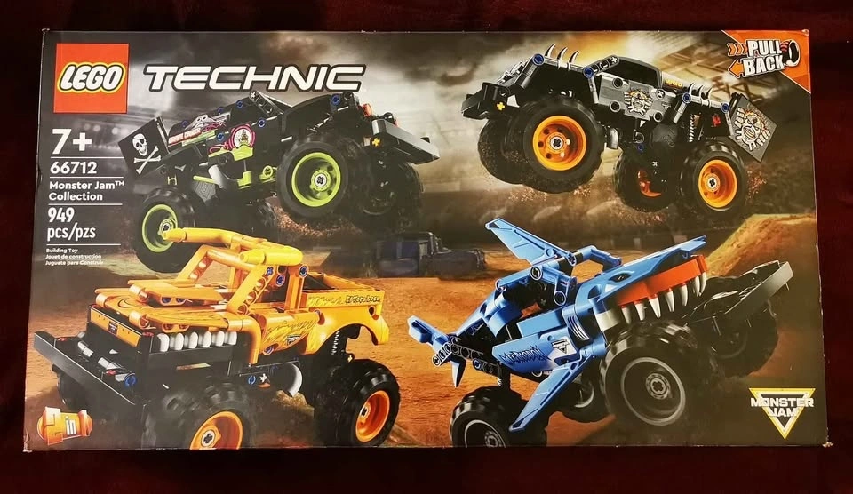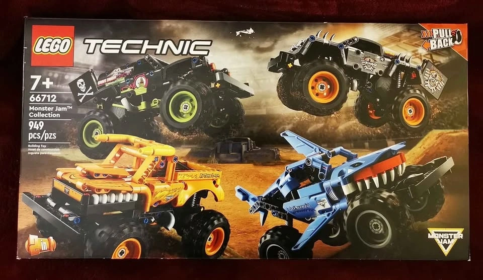 This value pack includes 4 retired LEGO Technic Monster Jam sets: 42118 Grave Digger, 42119 Max D, 42134 Megalodon, and 42135 El Toro Loco. Together, they have 949 pieces. All 4 individual truck sets are retired and no longer sold separately. These Monster Trucks have pull-back action. Perfect gift for any Monster Jam fan!