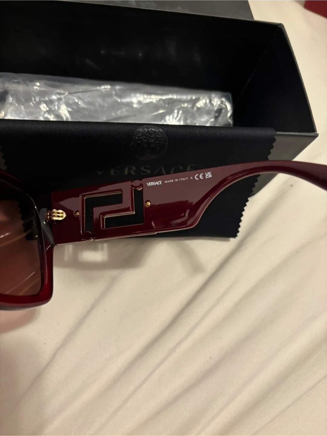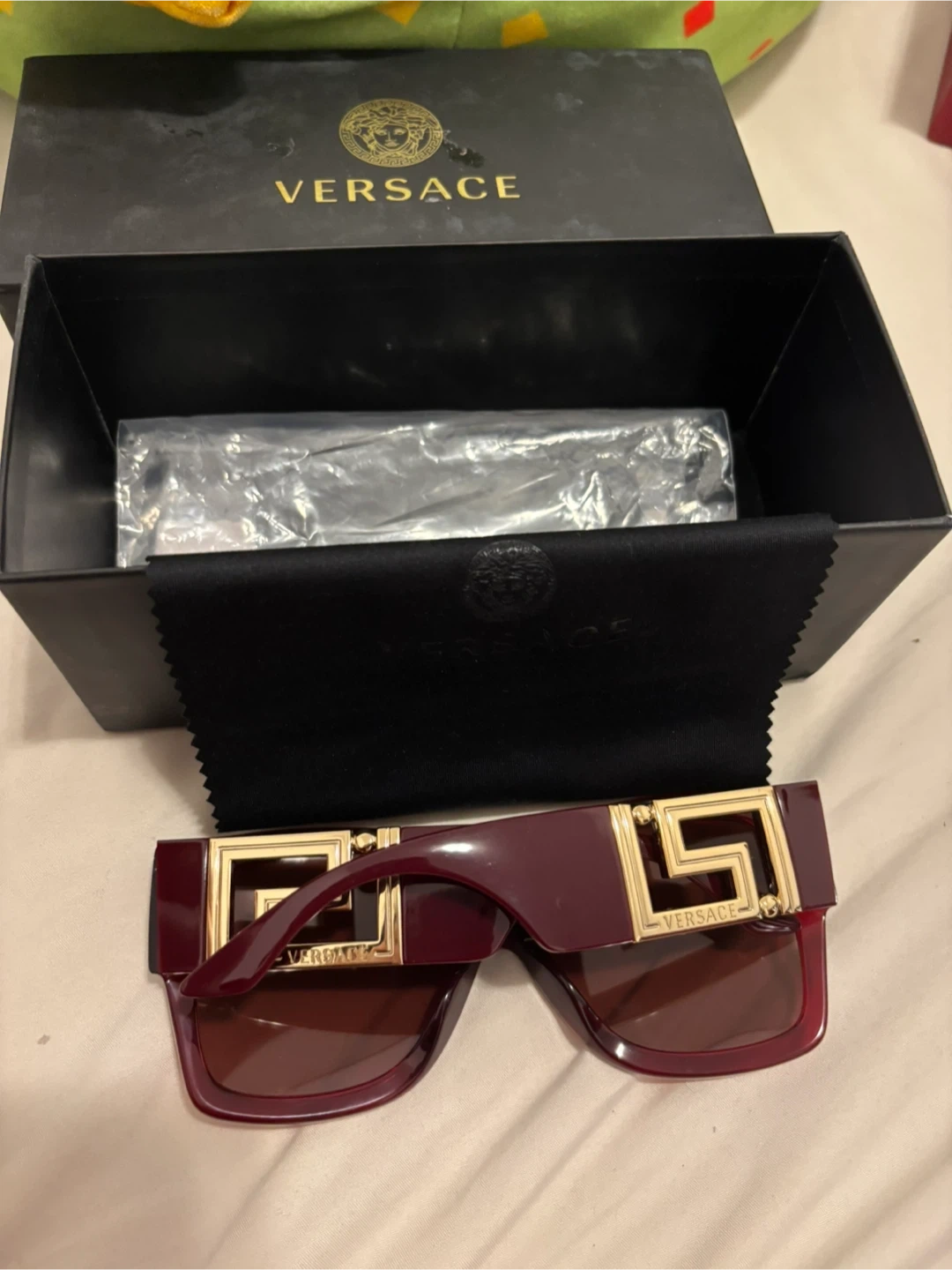 Selling a pair of Versace sunglasses, model MOD.4402. They come in a beautiful burgundy colour and include the original box and cleaning cloth. The sunglasses have a stylish design with the Versace logo on the sides. They are new and ready for a new owner!