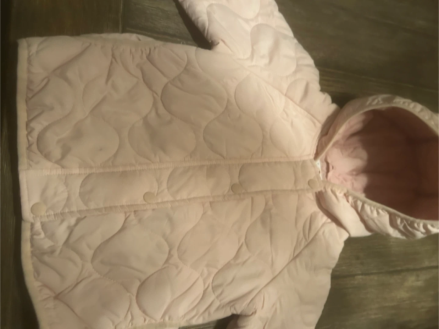 This is a sweet pink quilted hooded jacket for a child. It features a full zip closure and snap buttons for extra security. It's lined with soft fabric for comfort. Size 4/5