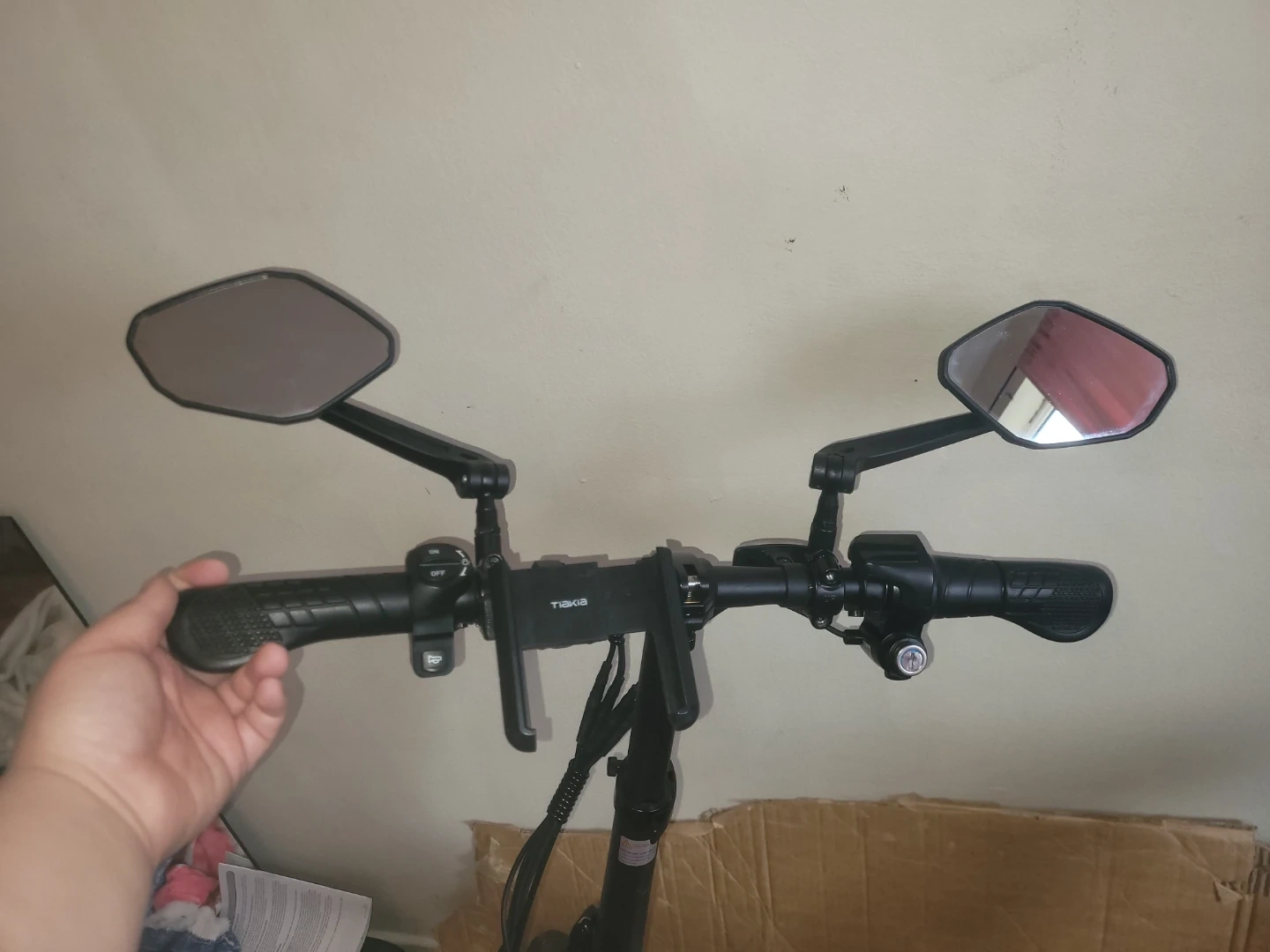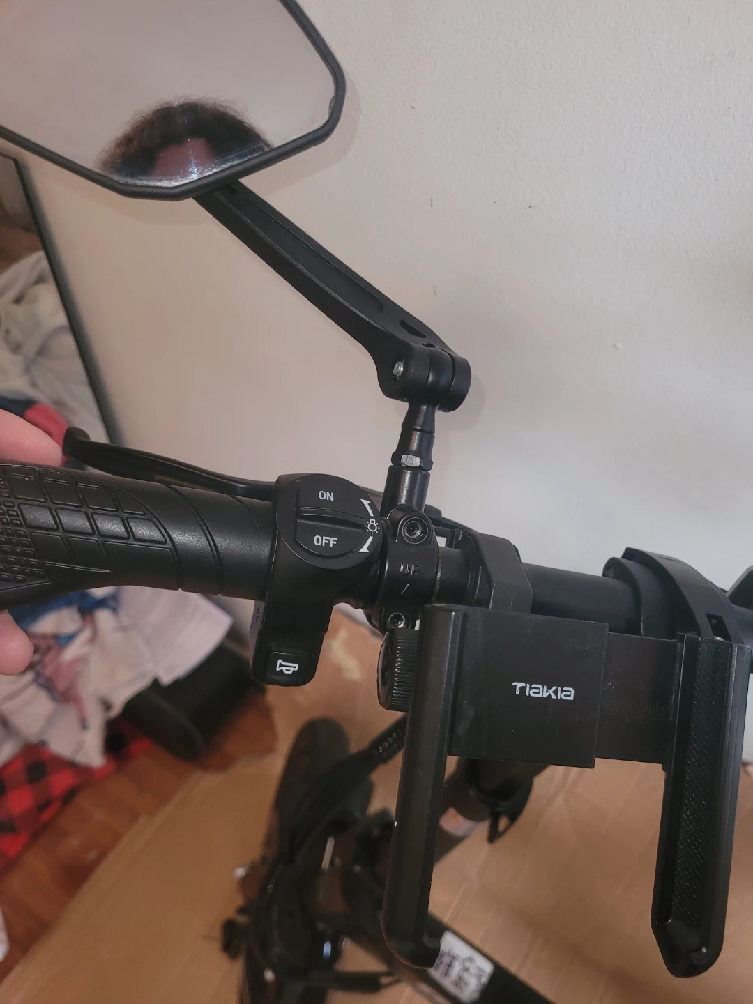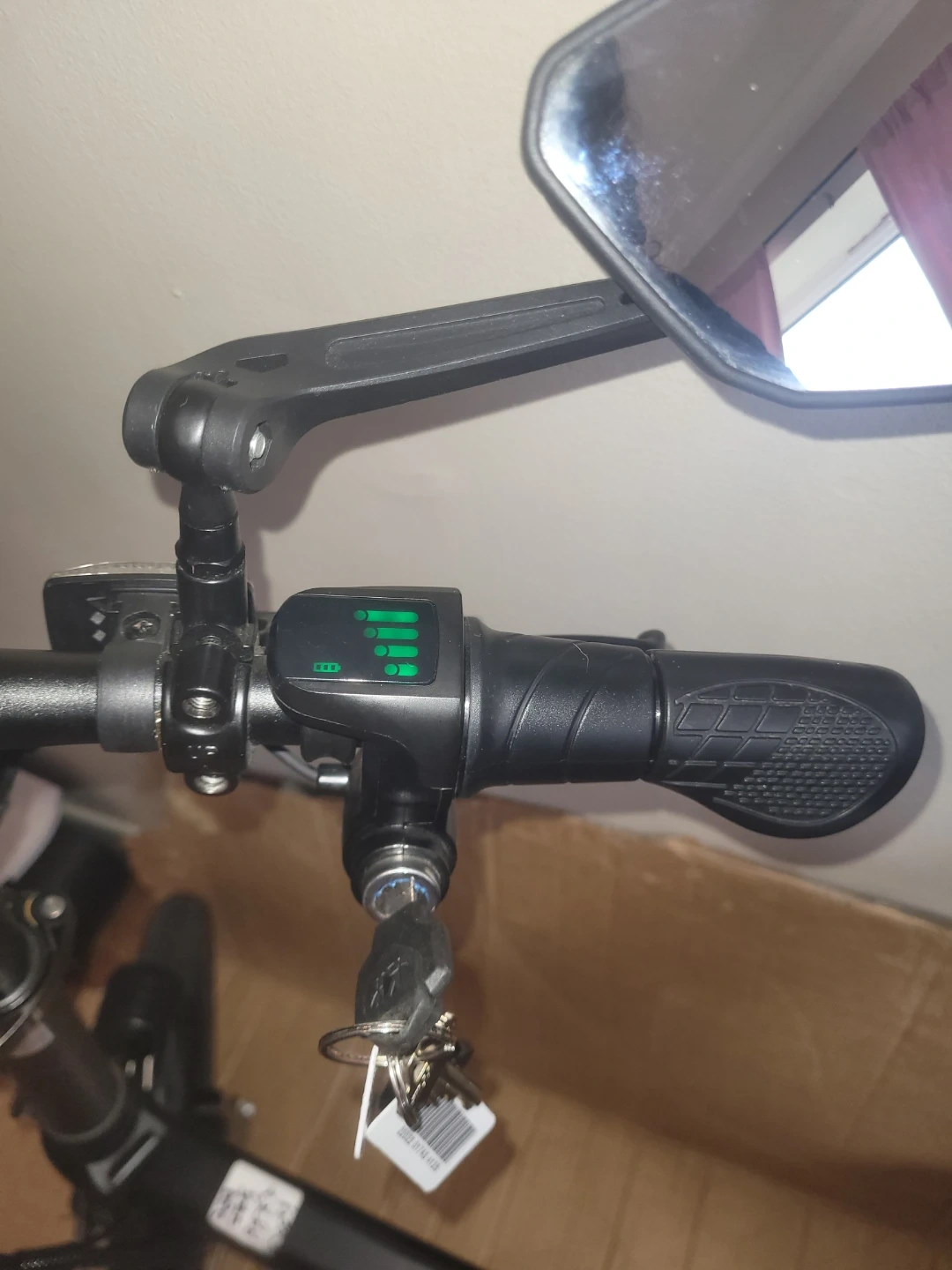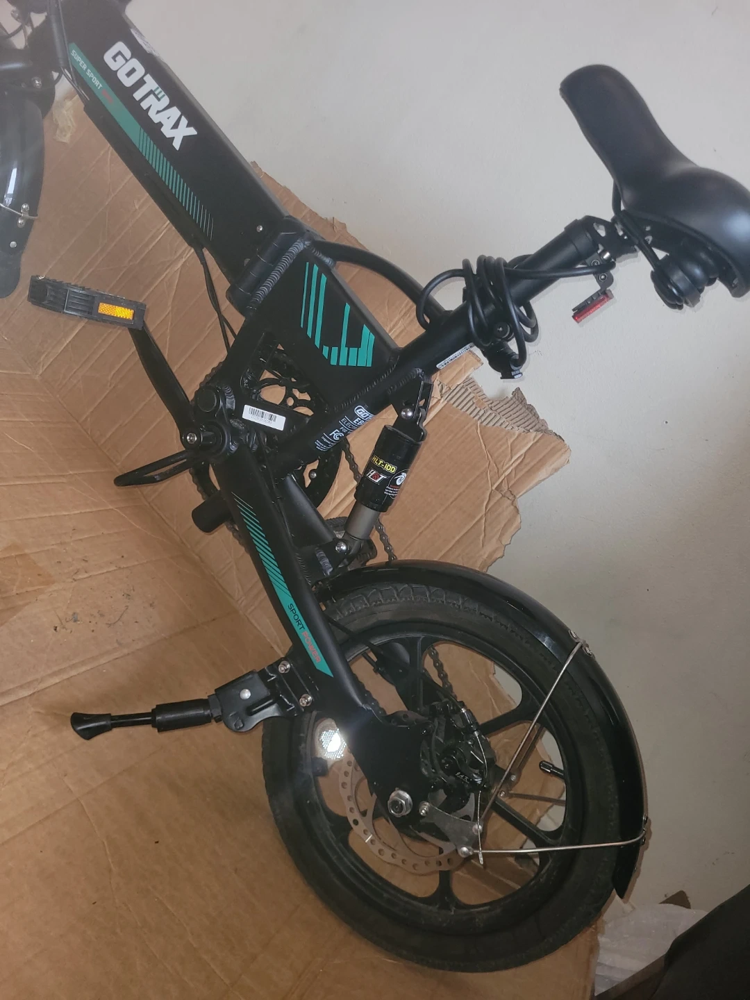 GoTrax Super Sport electric folding bike. It's black with teal accents. Features include foldable frame, disc brakes, and a built-in headlight. Great for commuting or recreational rides! Bike has mirrors added on for added safety and a phone mount.