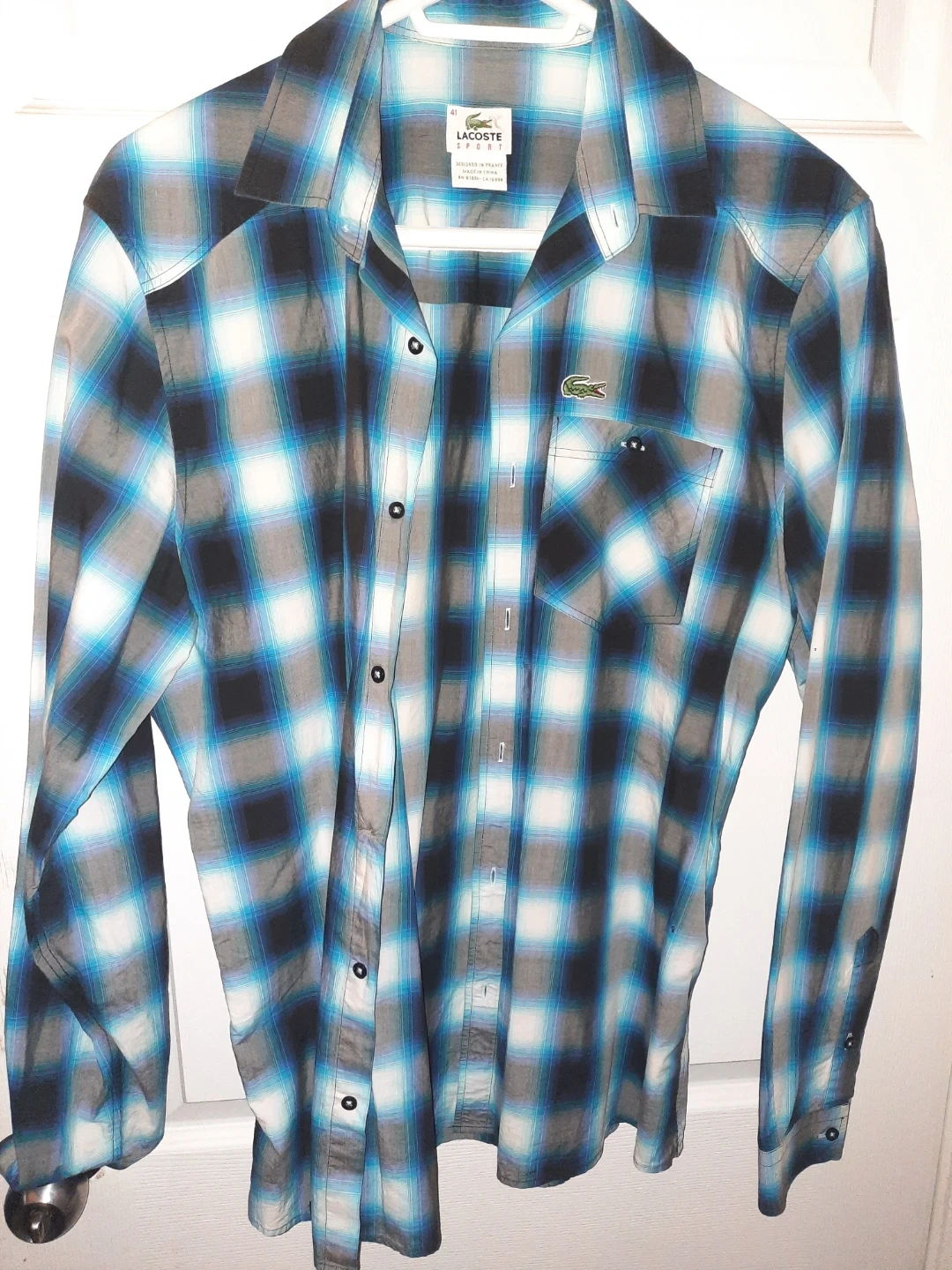 Classic plaid button-up shirt from Lacoste Sport. Features a chest pocket and the iconic crocodile logo. Made with a comfortable cotton blend ,,, missing one button