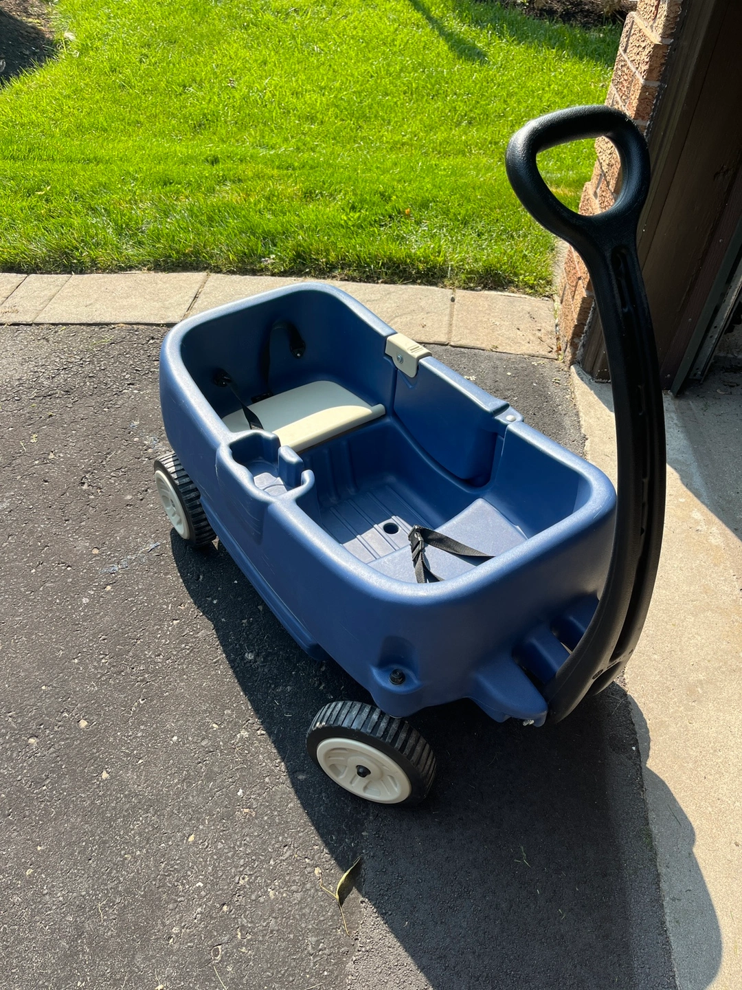 Blue wagon with handle and seat. Good condition. Used just a few times so still looks good. All of the wheels turn smoothly.