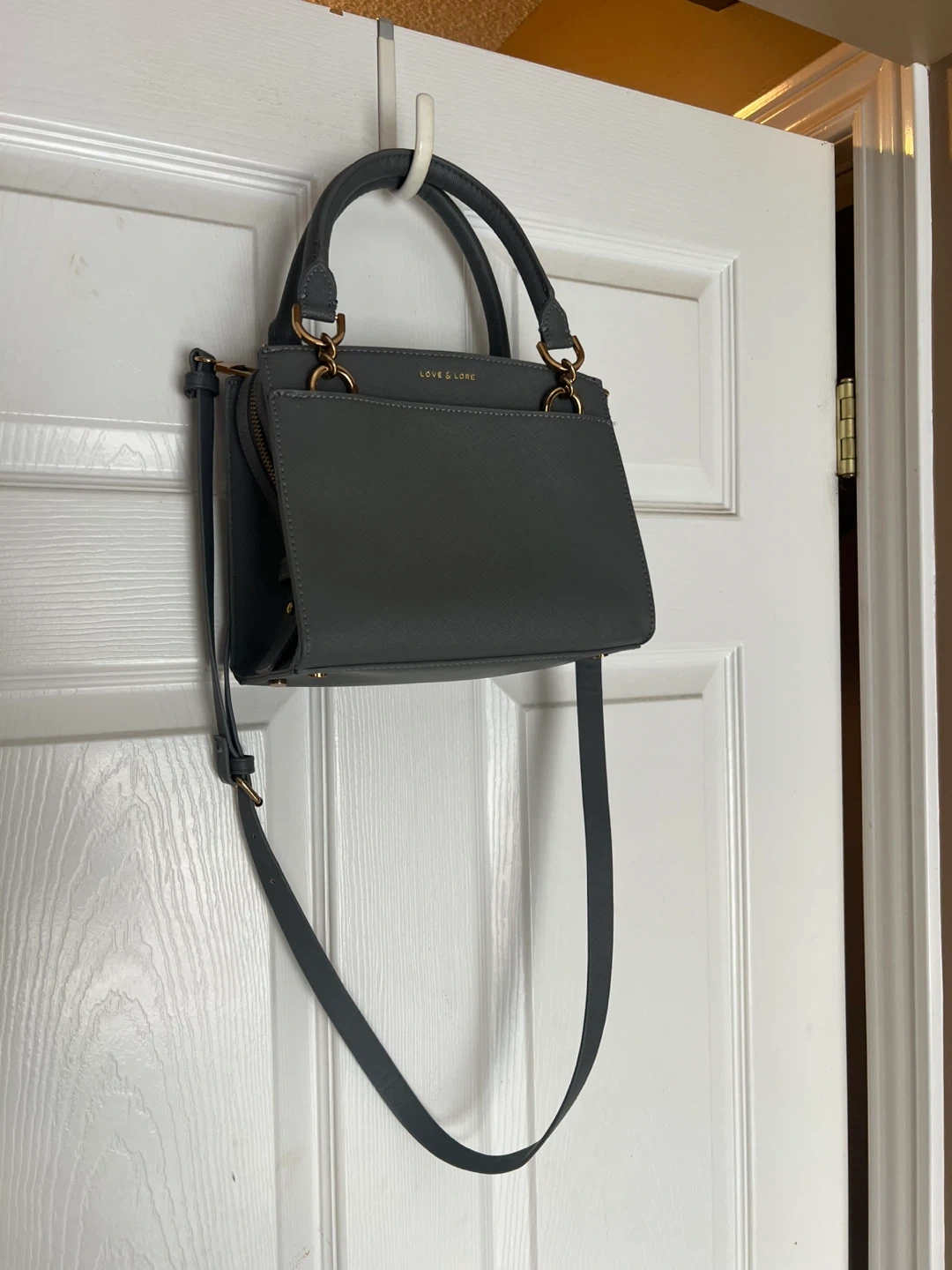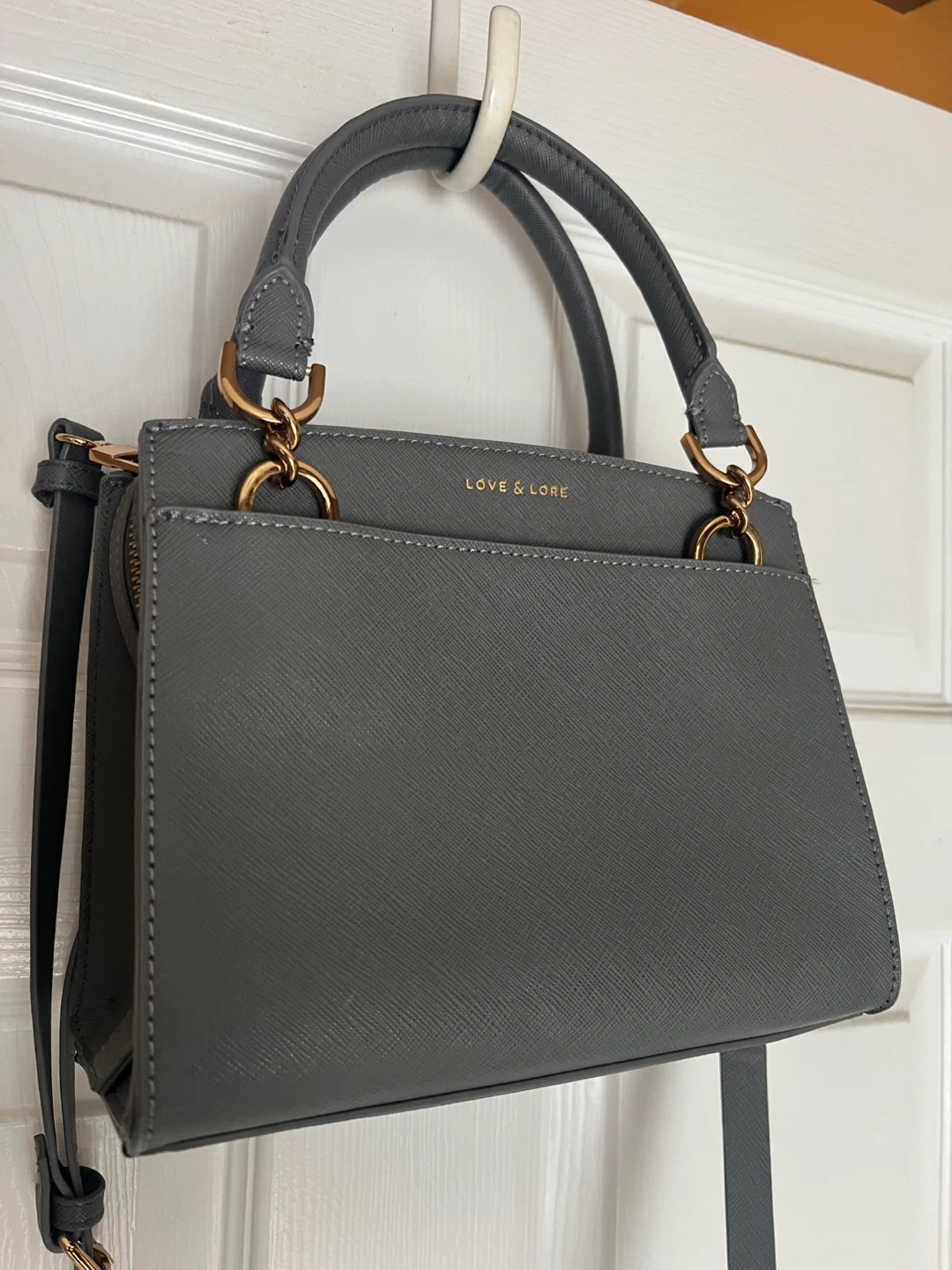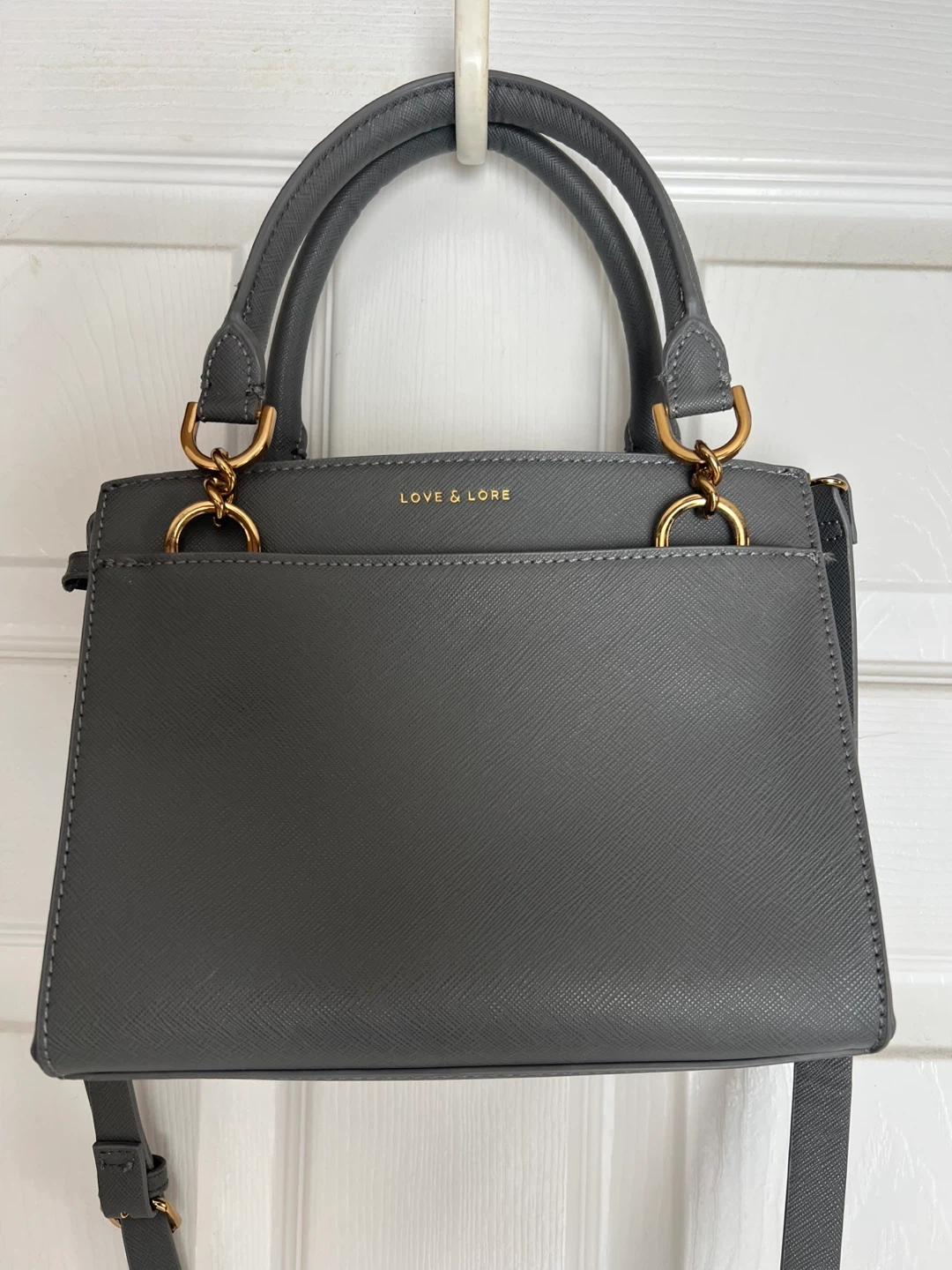 This is a Love & Lore grey satchel purse with gold hardware. It's made of saffiano faux leather and includes a detachable crossbody strap. It has a zippered main compartment and a front slip pocket.