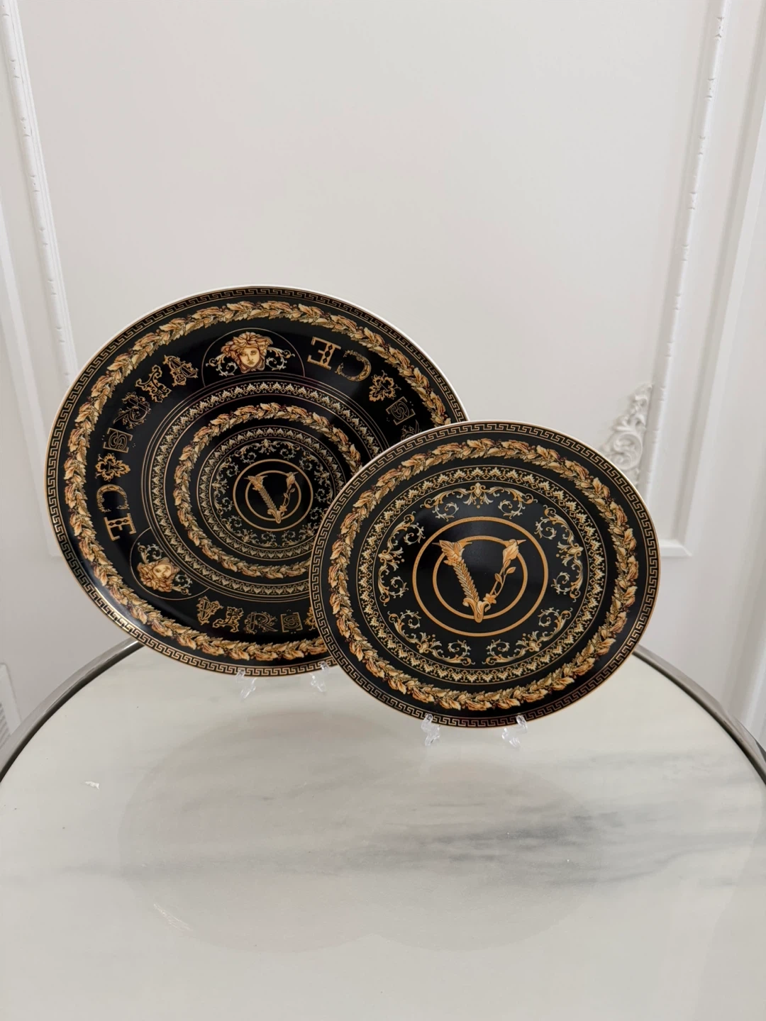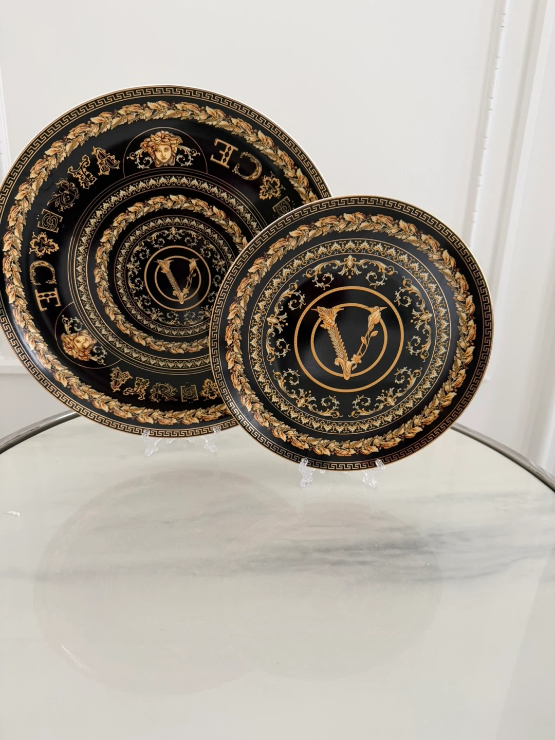 These are two Versace dinner plates with a black and gold Greek key design. The plates feature the iconic Versace Medusa head and logo. They're made of high-quality porcelain.