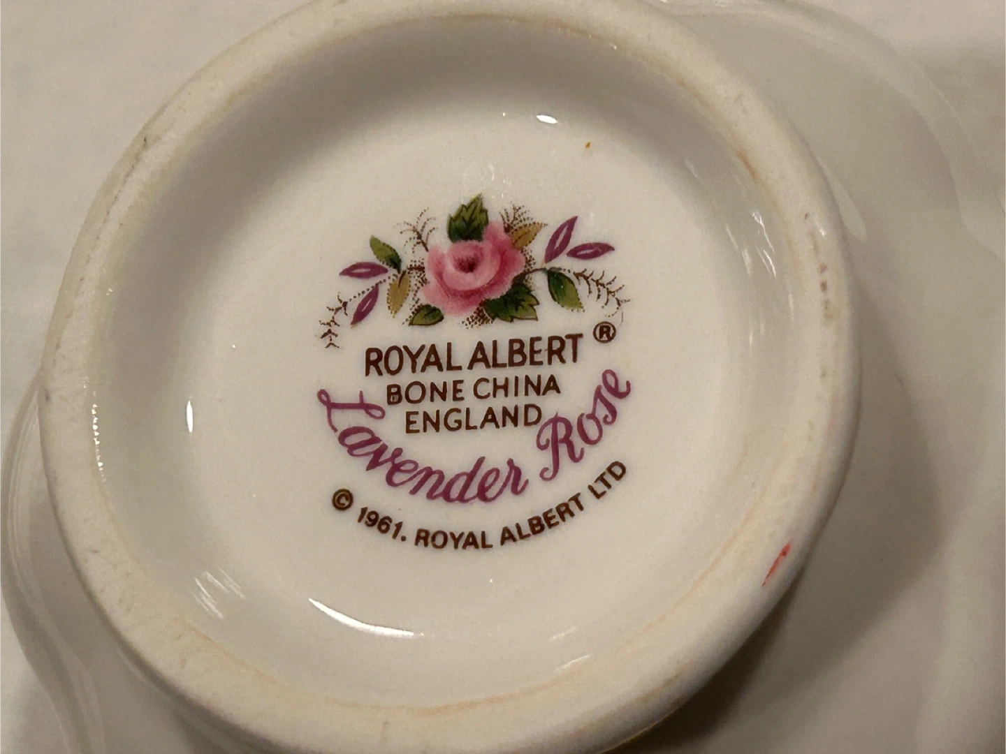 Beautiful Royal Albert bone china dinnerware set in the Lavender Rose pattern. This set includes a teapot, sugar bowl with lid, creamer, cup, and saucer, along with dinner plates, side plates and dessert plates. It's adorned with delicate pink roses and gold trim. Perfect for an elegant family dinner.