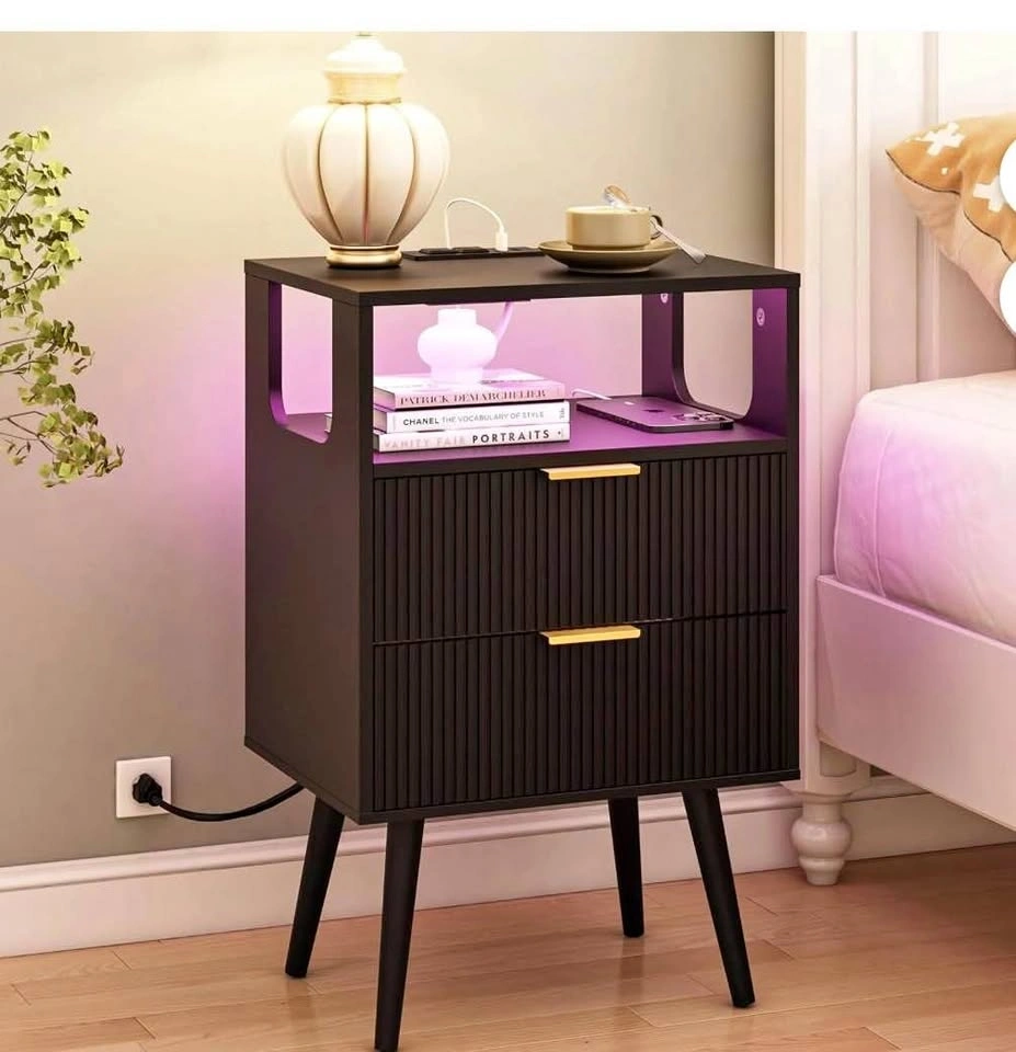 Brand new nightstand with charging station and LED lights. Modern bedside table with 2 storage drawers and an open wood shelf, perfect for bedrooms and small spaces. Features solid wood legs.