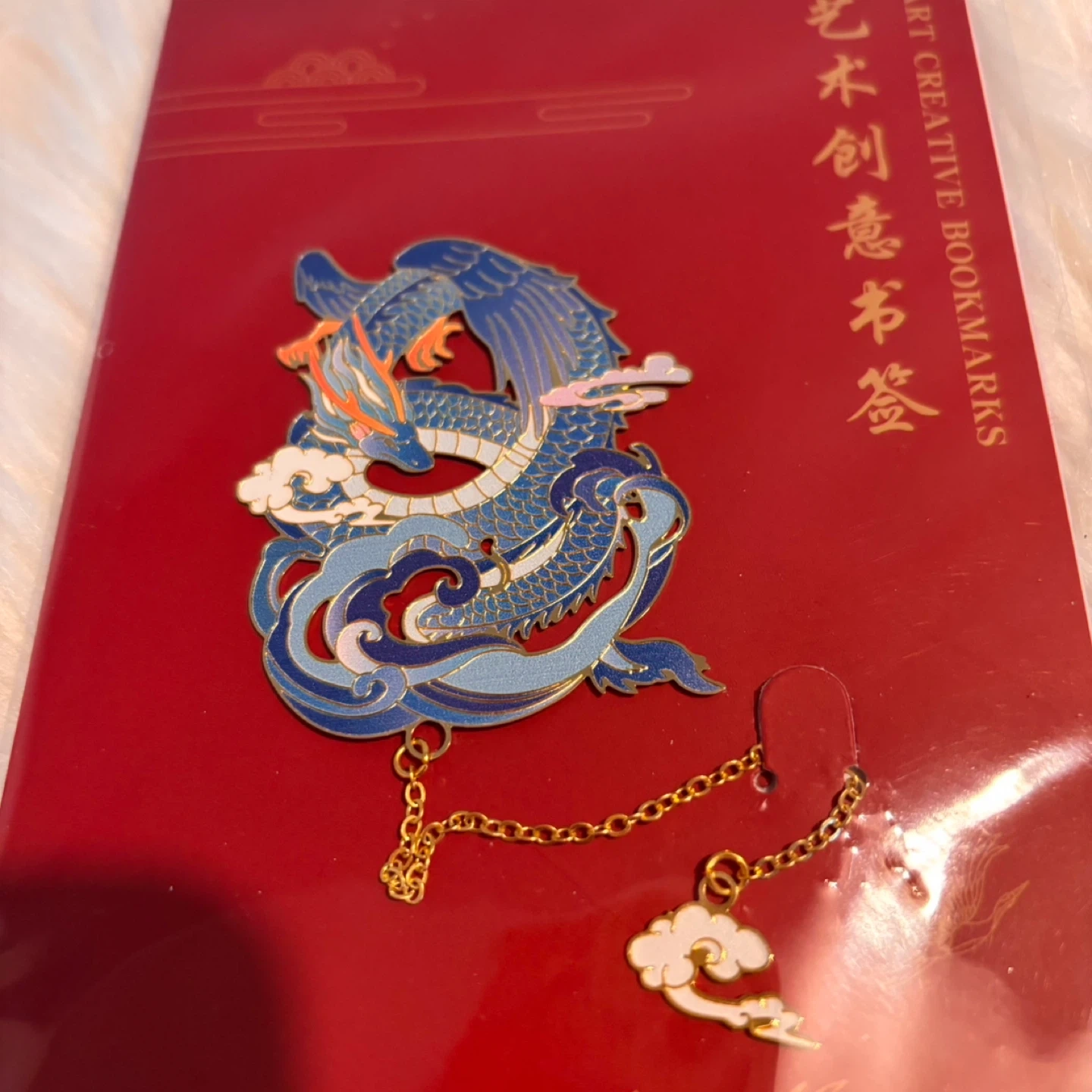 This is an art creative bookmark featuring a blue dragon design. It's made of metal. It's perfect for marking pages in your favourite books!