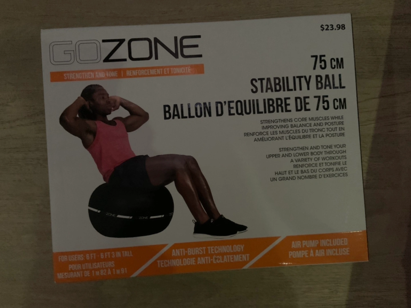 75cm stability ball. Strengthens core muscles while improving balance and posture. Strengthens and tones upper and lower body. Anti-burst technology. Air pump included. For users 6ft - 6ft 3in tall.