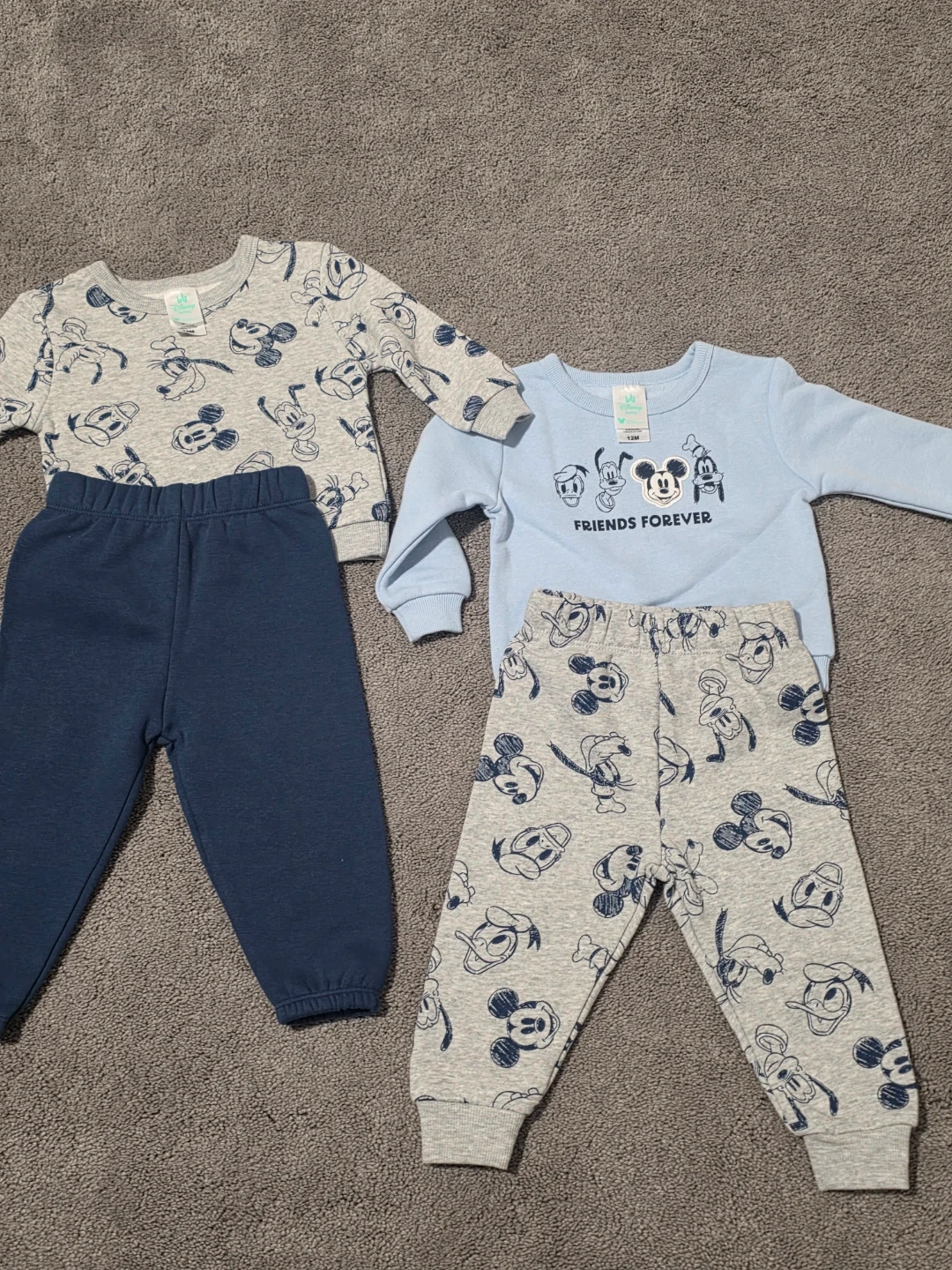 Two outfits featuring Mickey Mouse and other Disney characters. One set includes a grey long-sleeved shirt with an all-over print and matching grey pants. The other set has a light blue long-sleeved shirt with 'Friends Forever' and character graphics, paired with grey patterned pants. Both sets are labelled 12 months.