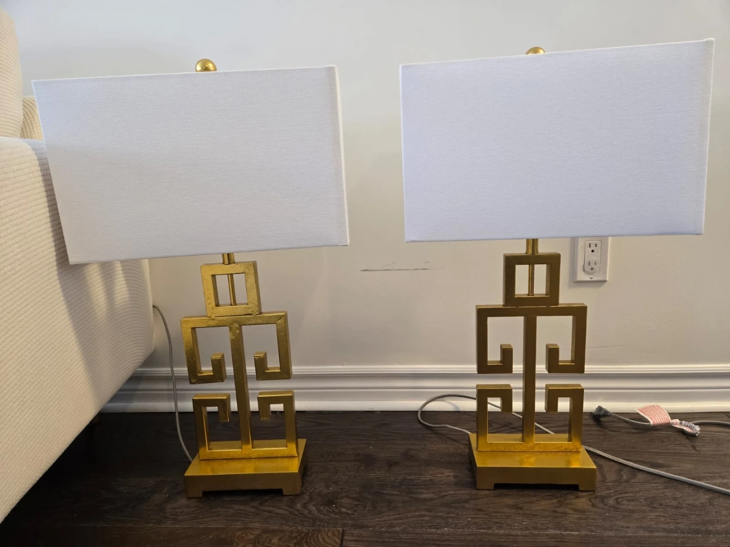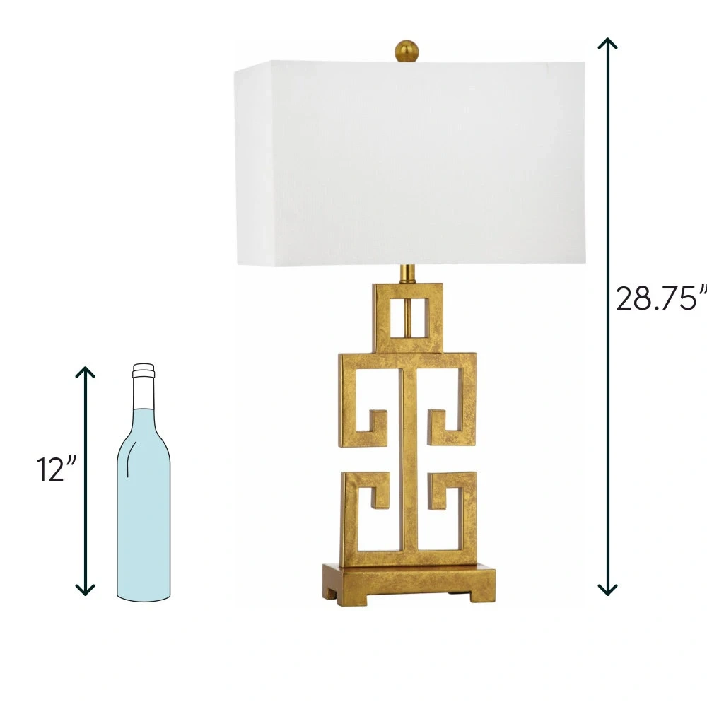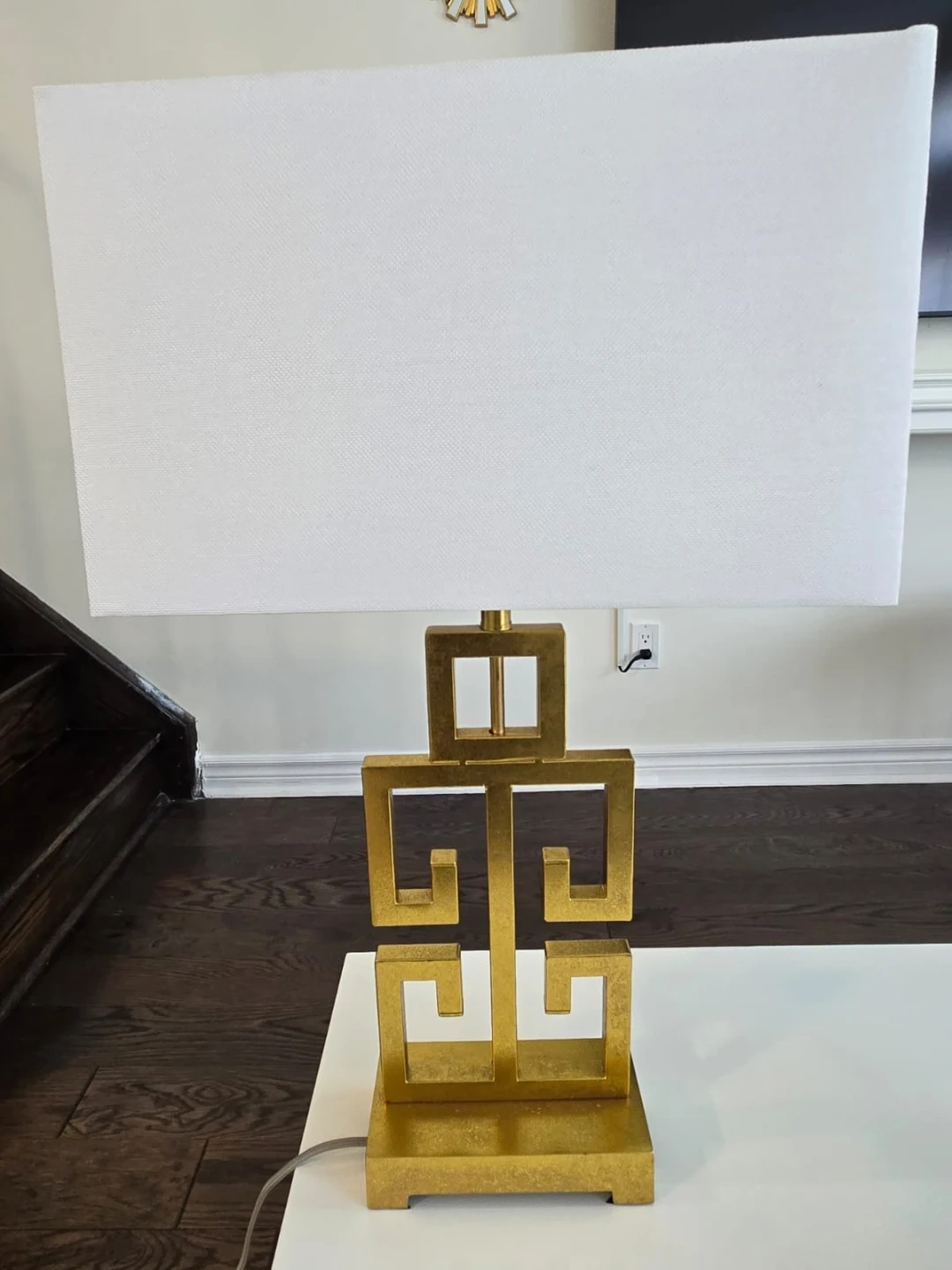 A stylish pair of table lamps with a gold finish and a distinctive Greek key design on the base. They're topped with white rectangular shades. Lamp height is 28.75 inches. These lamps add a touch of elegance to any room!