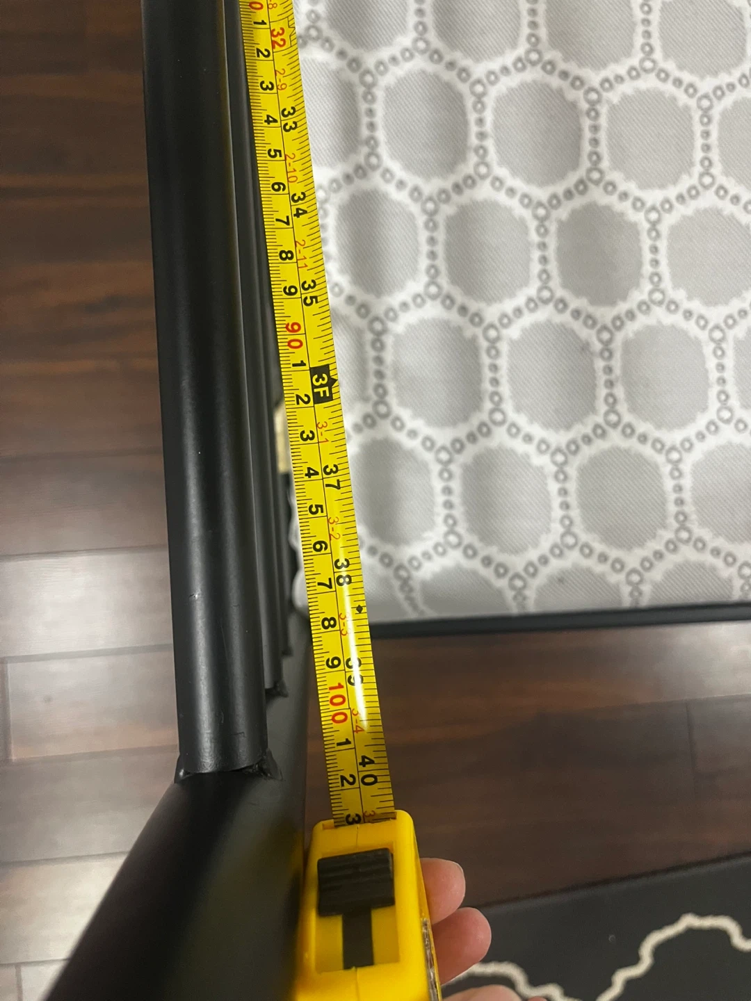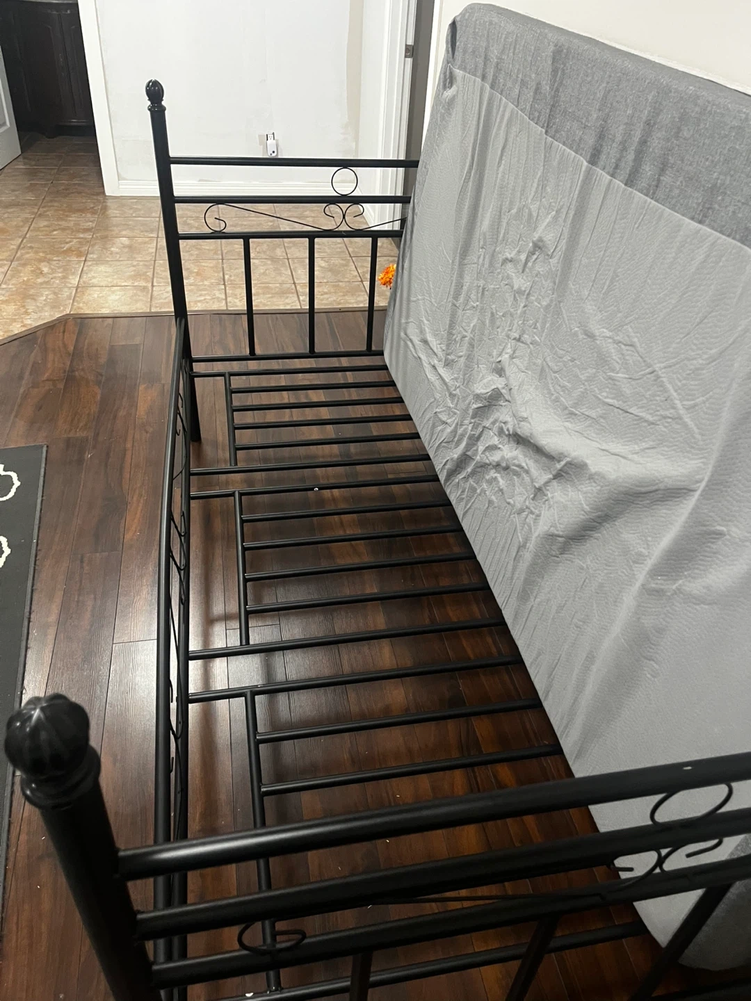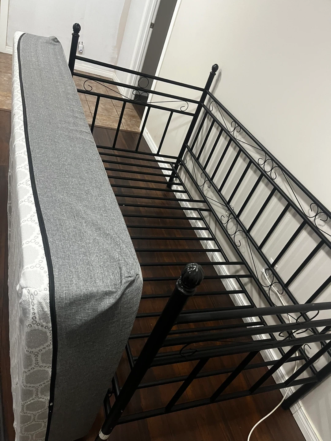 Black metal daybed frame with decorative scrollwork. Includes a grey and white patterned mattress. Metal construction, twin size.