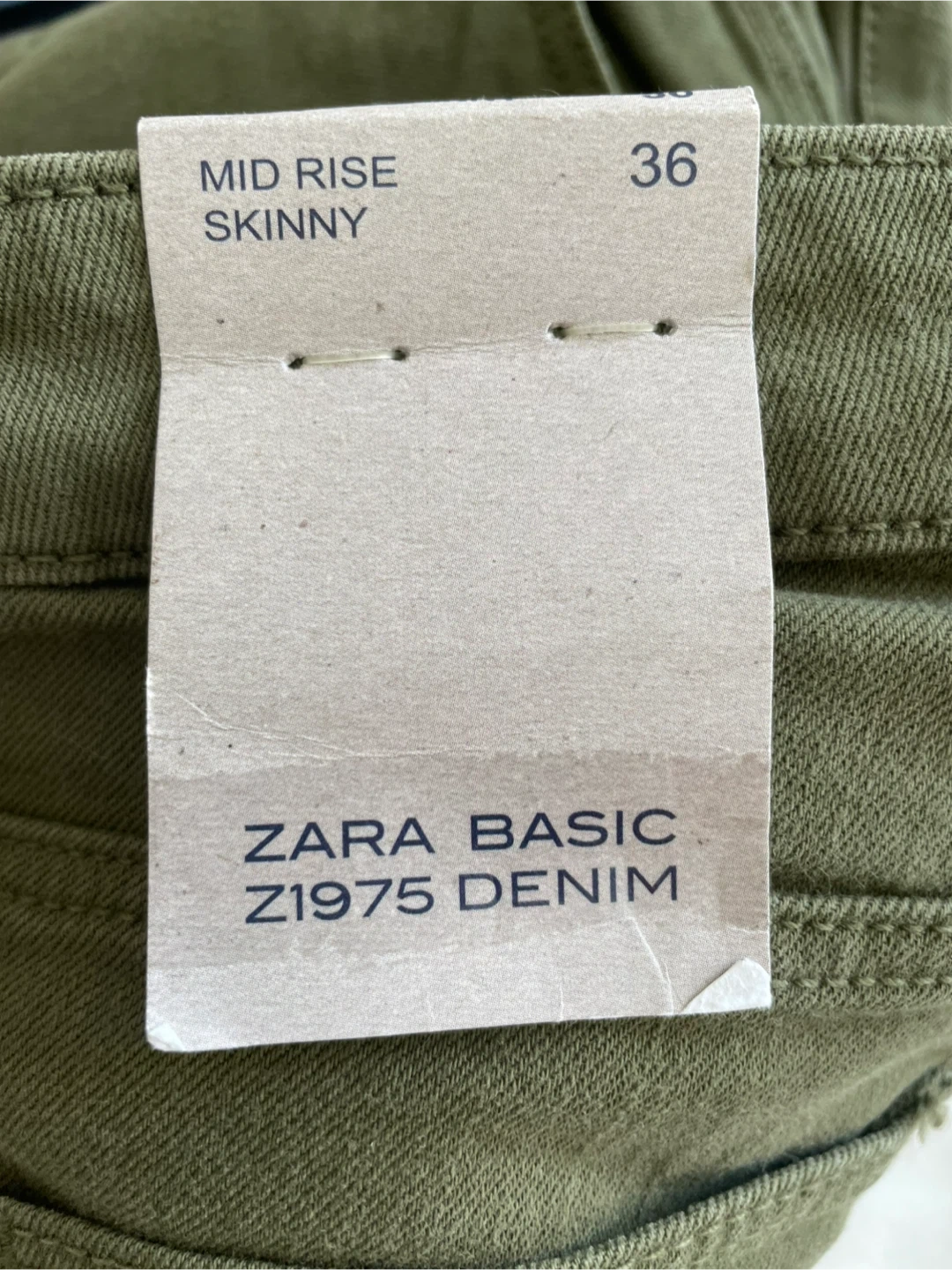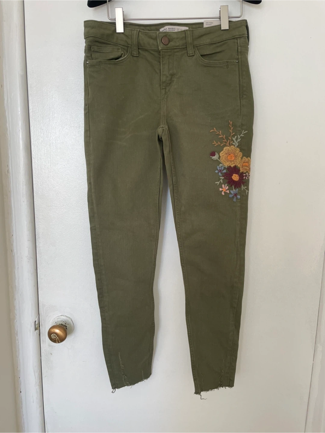 Olive green Zara Basic Z1975 Denim skinny jeans. Features mid-rise waist and embroidered floral details on the leg. Made in Turkey. Size 36. These jeans offer a stylish and comfortable fit.