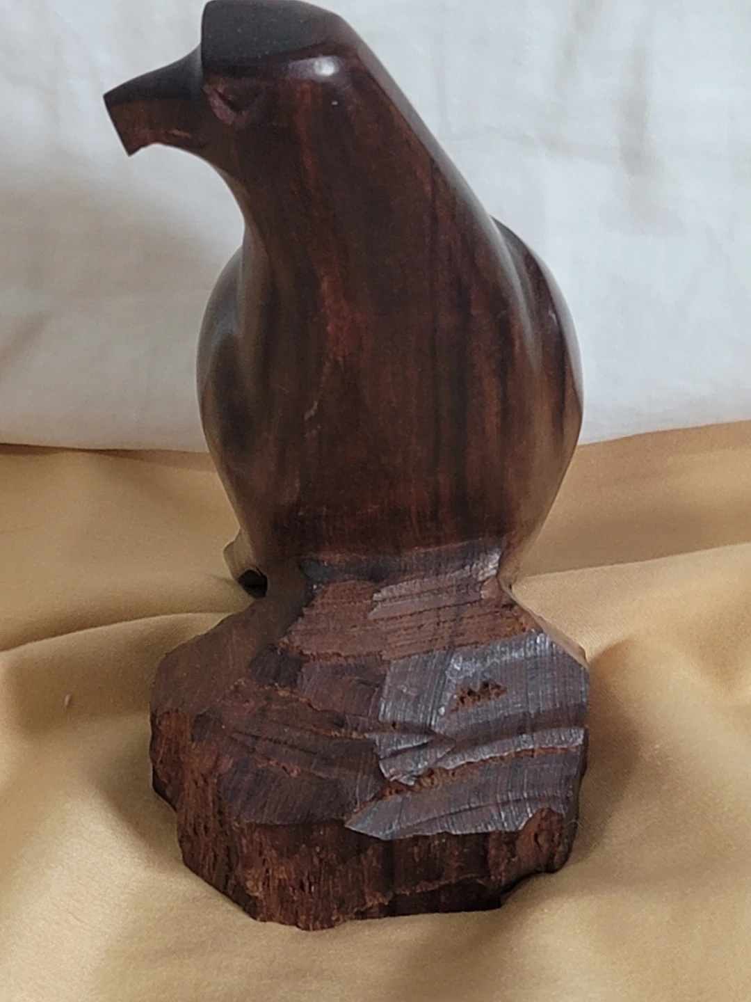 This is a carved ironwooden bird figurine. It's made from dark wood The detailed carving gives it a realistic appearance.