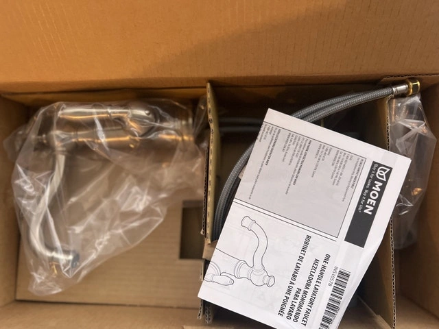 Selling a brand new Moen Weymouth S42107BN brushed nickel basin faucet. It features a high-arc spout and an elegant design, perfect for updating your bathroom. This faucet is still in its original packaging.