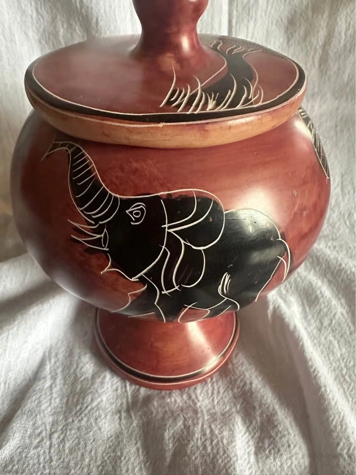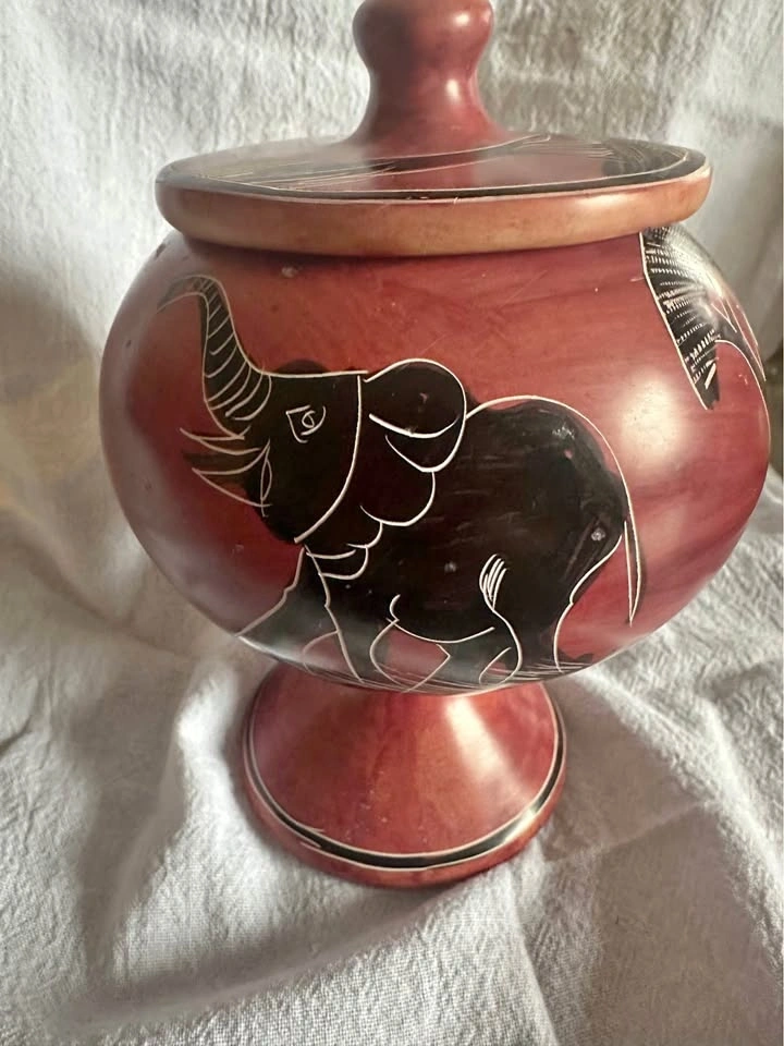 Made in Kenya, the detailed portraiture carving is an authentic elephant’s and trees.