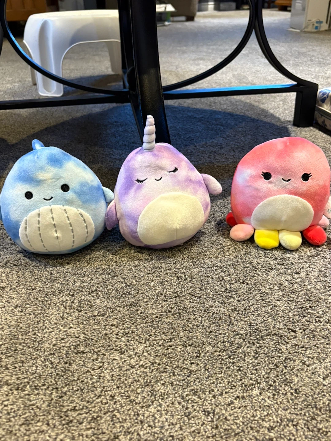 Three soft Squishmallows plush toys. Includes a blue whale, a purple narwhal, and a pink octopus with tye dye like tentacles.
