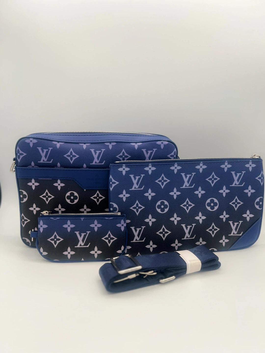 This set includes three Louis Vuitton monogram pouches in a blue gradient. It comes with a detachable strap. Perfect for organizing your essentials.