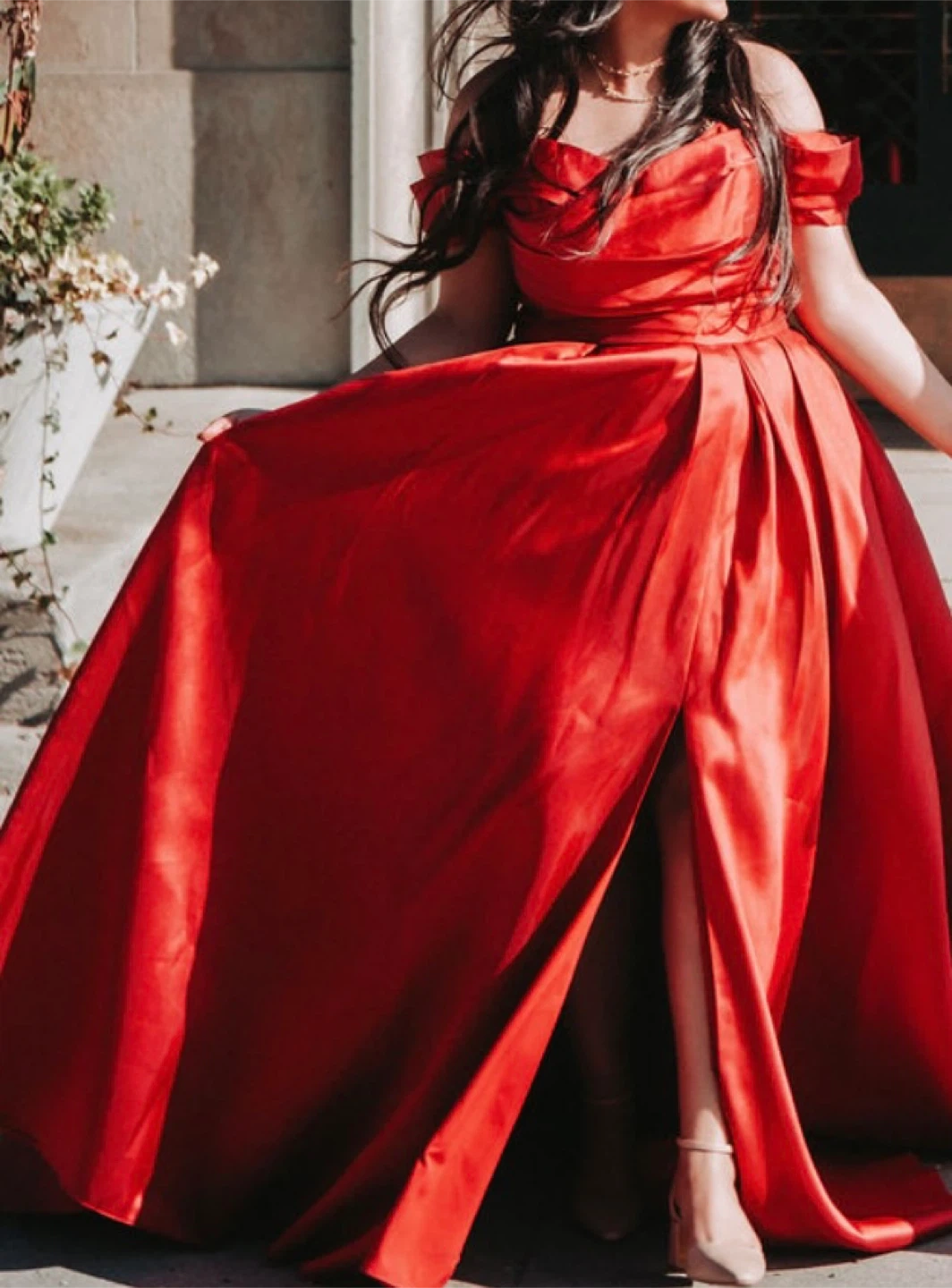 Stunning floor-length red gown with an elegant off-shoulder design and a full-flair that gives a grand, princess-style look. The structured, pleated bodice enhances the fit, while the rich red color makes it perfect for special occasions.