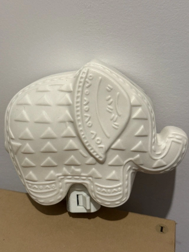 This adorable white elephant night light is perfect for a child's room or anyone who loves elephants! It's in great condition and provides a soft, comforting glow. Crafted of ceramic with plastic threaded socket. Cash accepted.