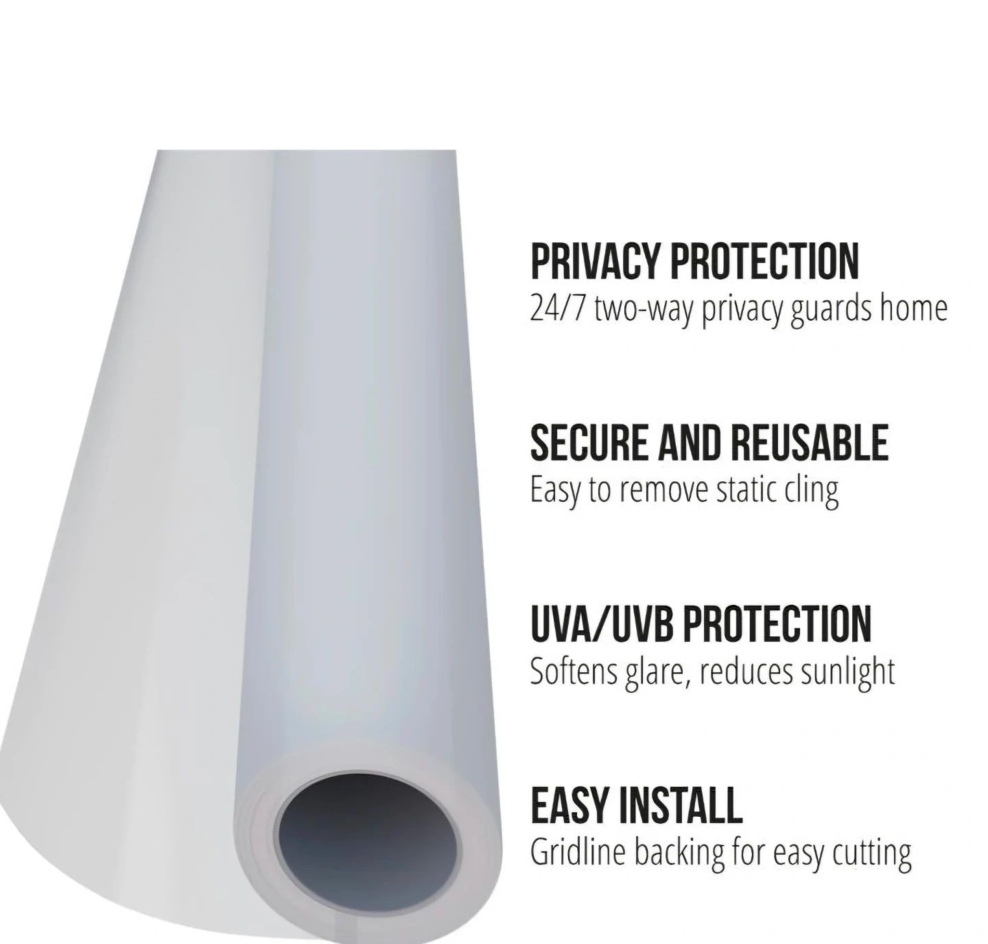 Gorilla Guard Two Way Window Privacy Film, Peel & Stick. 35.4" x 72" extra wide. Offers 24/7 two-way privacy for your home. Reusable, static cling application. Gridline backing makes cutting easy for a simple install!