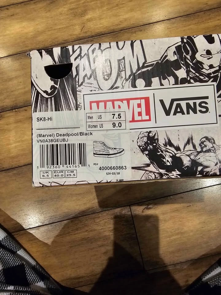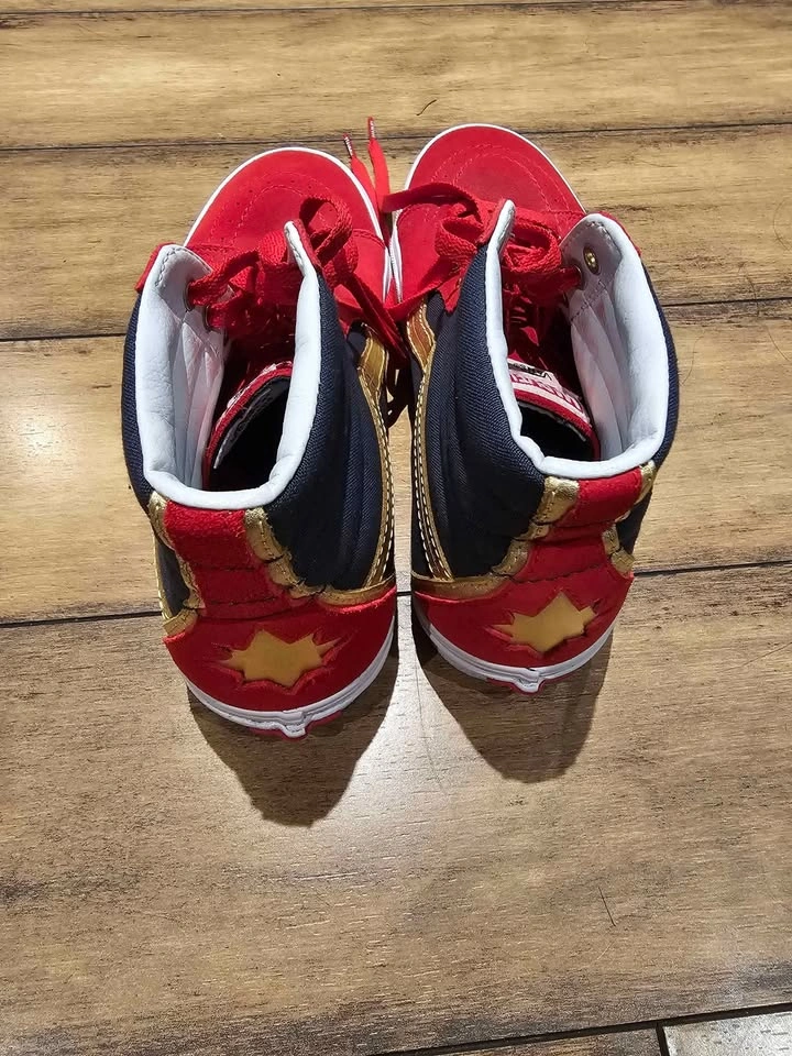 Deadpool Vans, used twice, still new, Size 9 women's, comes with the box. Captain Marvel Vans, never used, 9.5 women's, comes with a shoe bag. $20 each. Cash Only. Marine Drive Station.