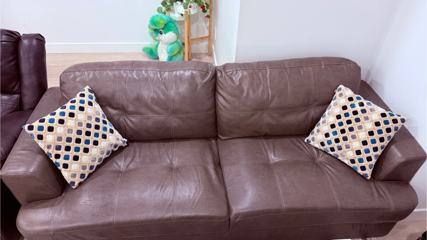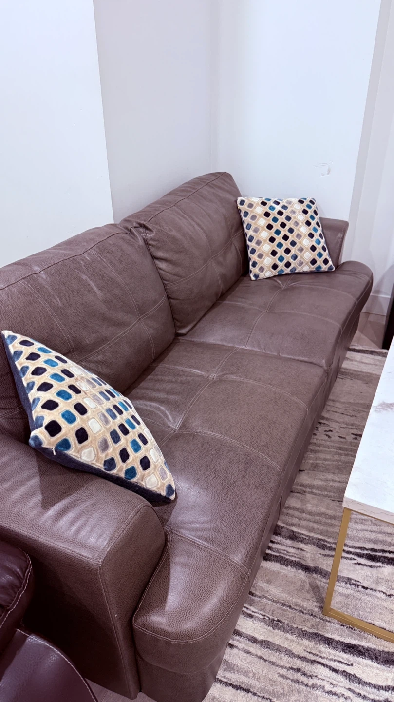 Comfortable brown leather sofa, perfect for relaxing! It features a tufted seat and back, with two decorative throw pillows included. This couch offers plenty of seating space for your living room. Add a touch of style and coziness to your home!