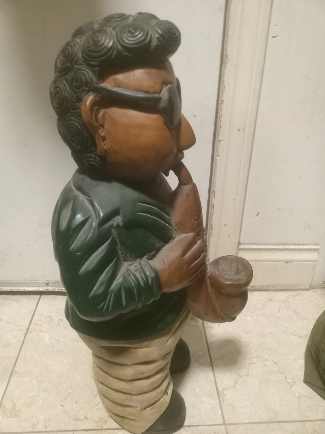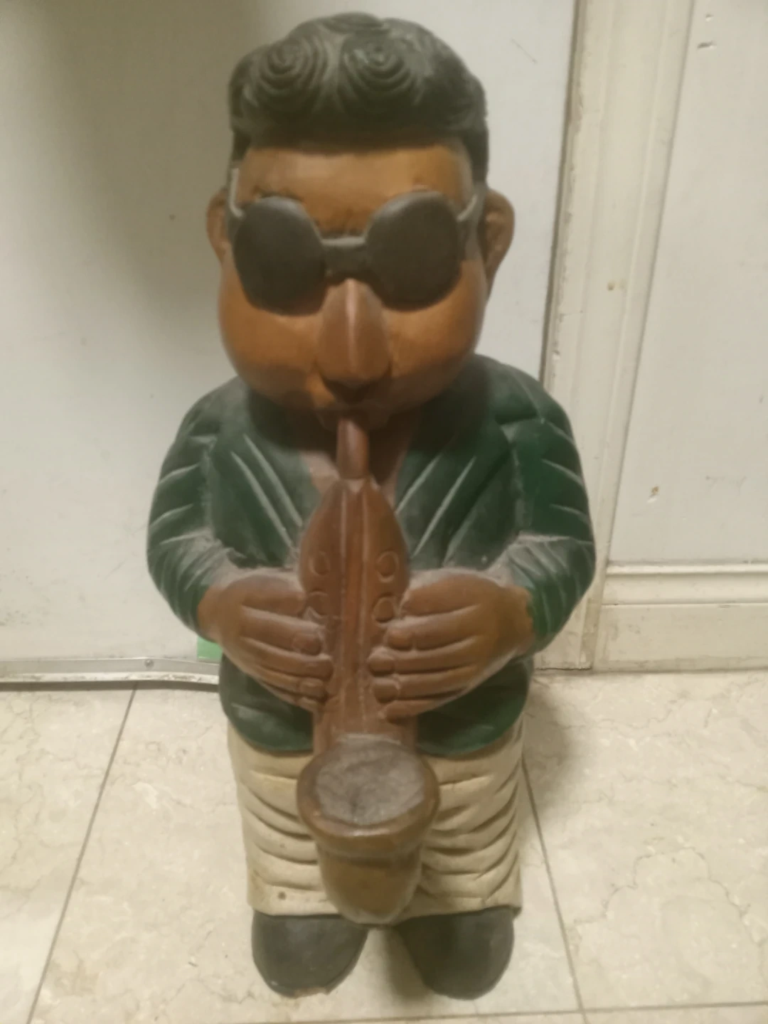 This is a charming wooden figurine of a man playing a saxophone. It's hand-carved with a detailed design, featuring sunglasses and a patterned shirt. Great for jazz enthusiasts or as a unique decorative piece!