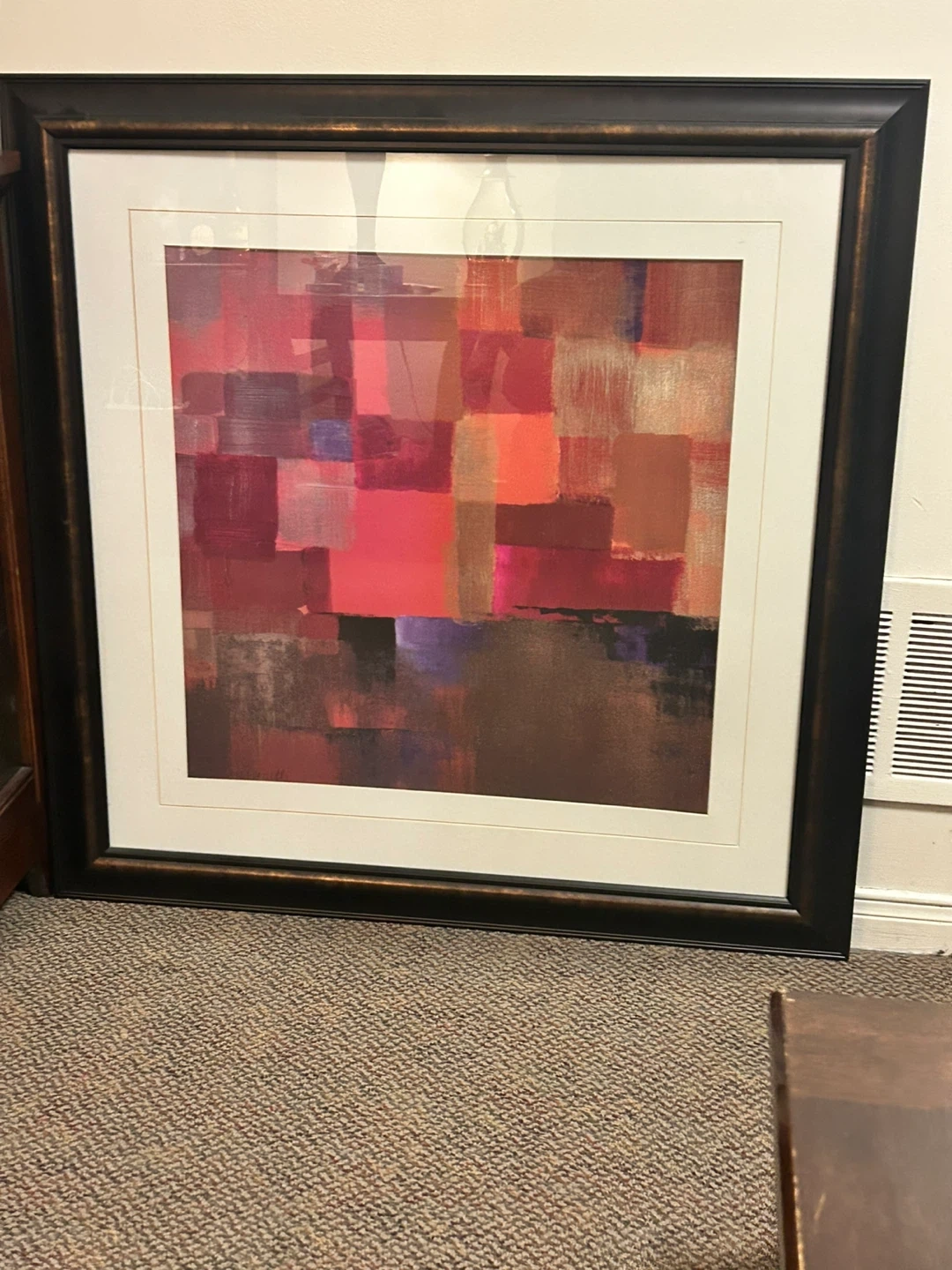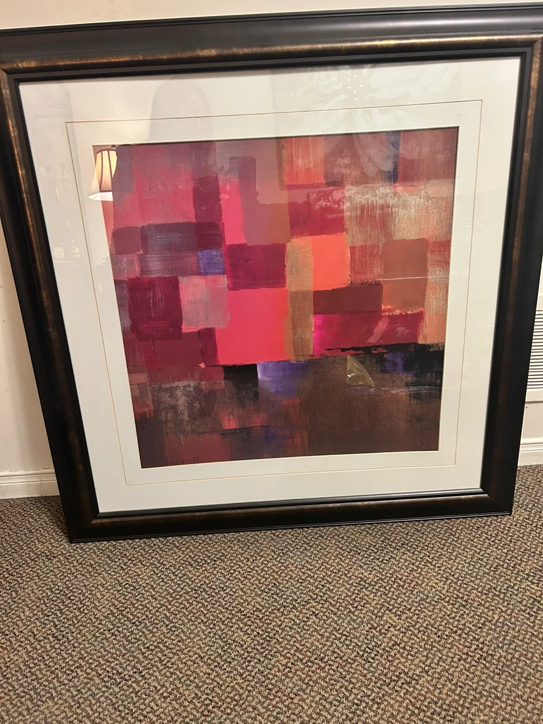This framed artwork 35”x35” features an abstract design with blocks of reds, pinks, and purples. It's housed in a dark frame. Ready to hang and add a pop of colour to your space!