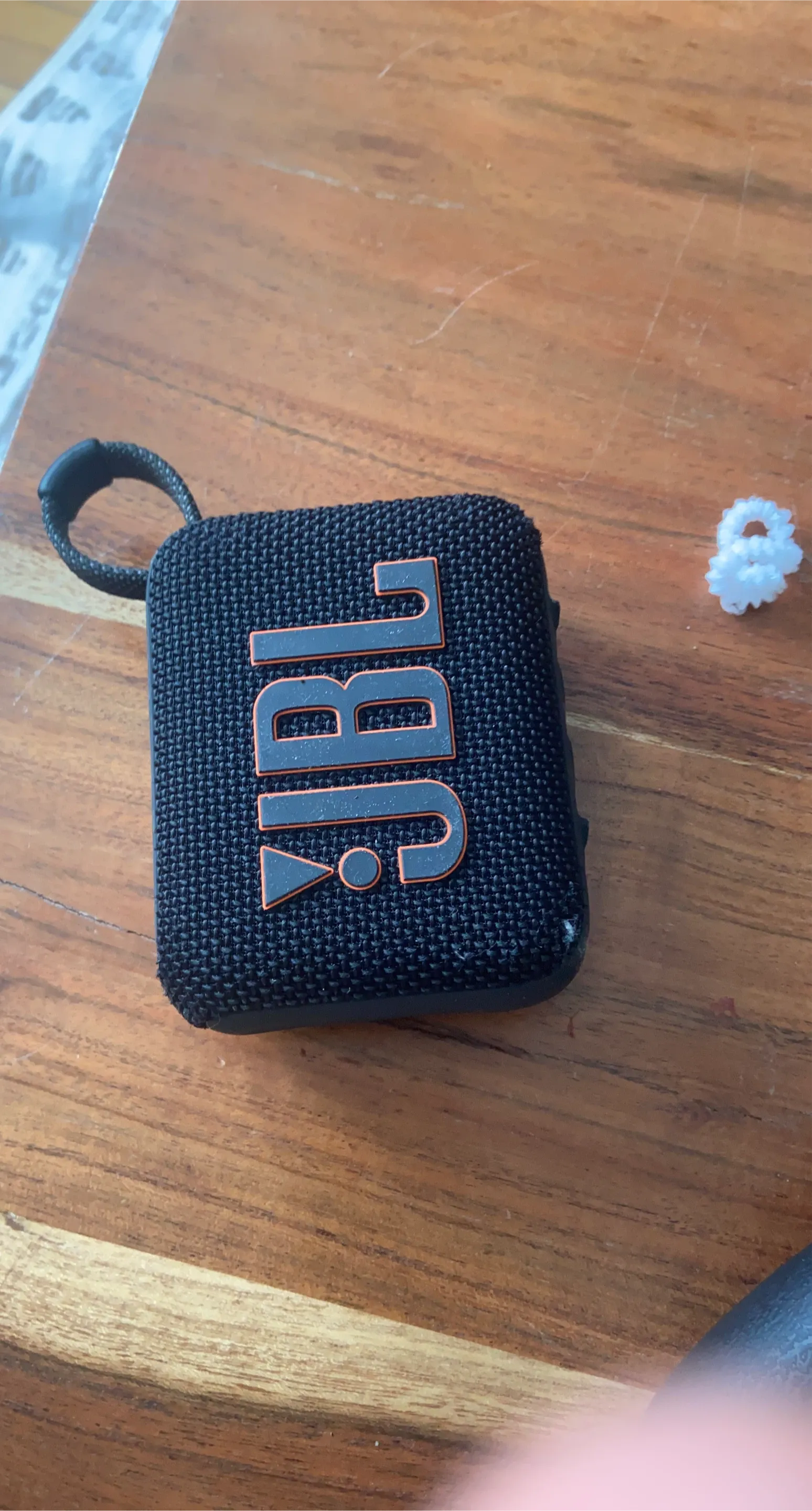 This is a black JBL Go 3 portable speaker with orange accents. It's waterproof and dustproof, making it great for outdoor use. It offers rich sound and a compact design, perfect for taking your tunes anywhere!